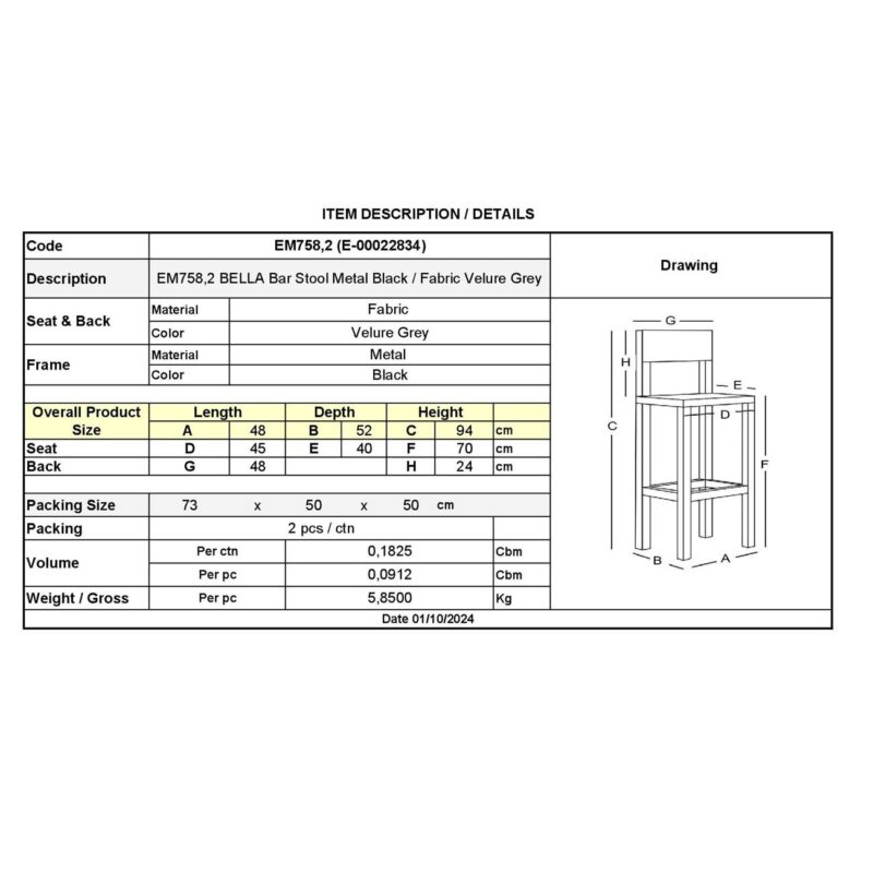 Бар стол, BELLA, Сив, Метал, 48х52х94см.
