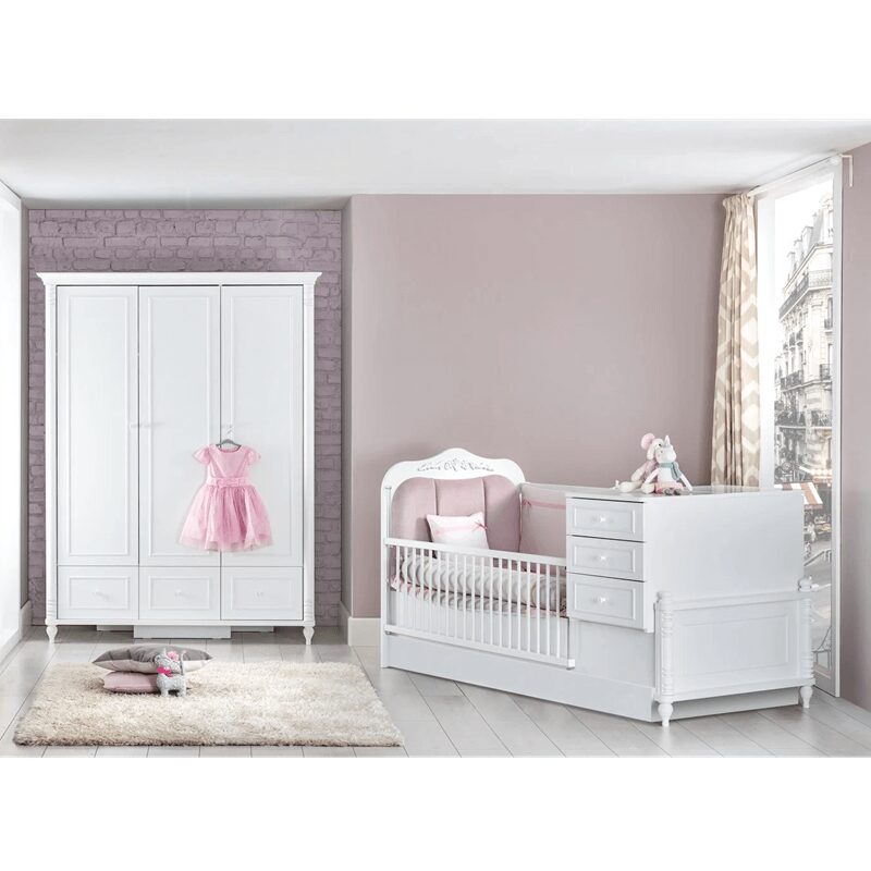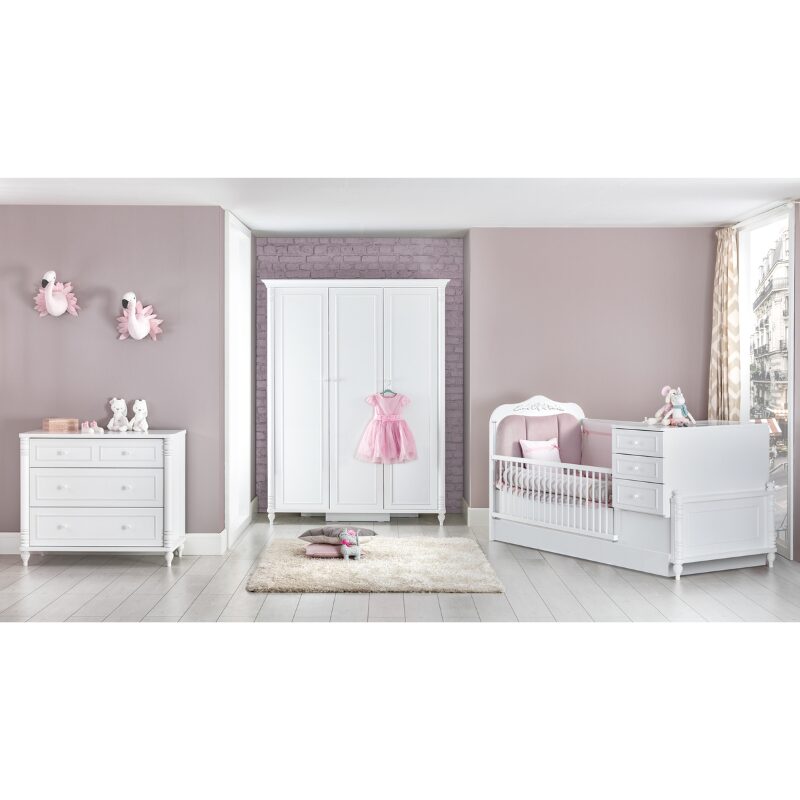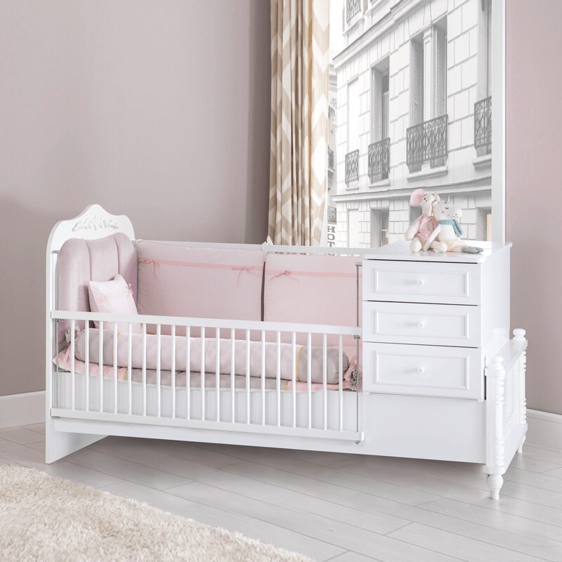 Открийте практичността на бебешка кошара NIL, която расте с вашето дете и лесно се трансформира в легло. С три удобни чекмеджета за съхранение, този модел е изработен от качествени ПДЧ и МДФ материали. Компактните размери (100x196x107 см) я правят идеална за всеки дом. Разгледайте допълнителната информация за повече детайли.