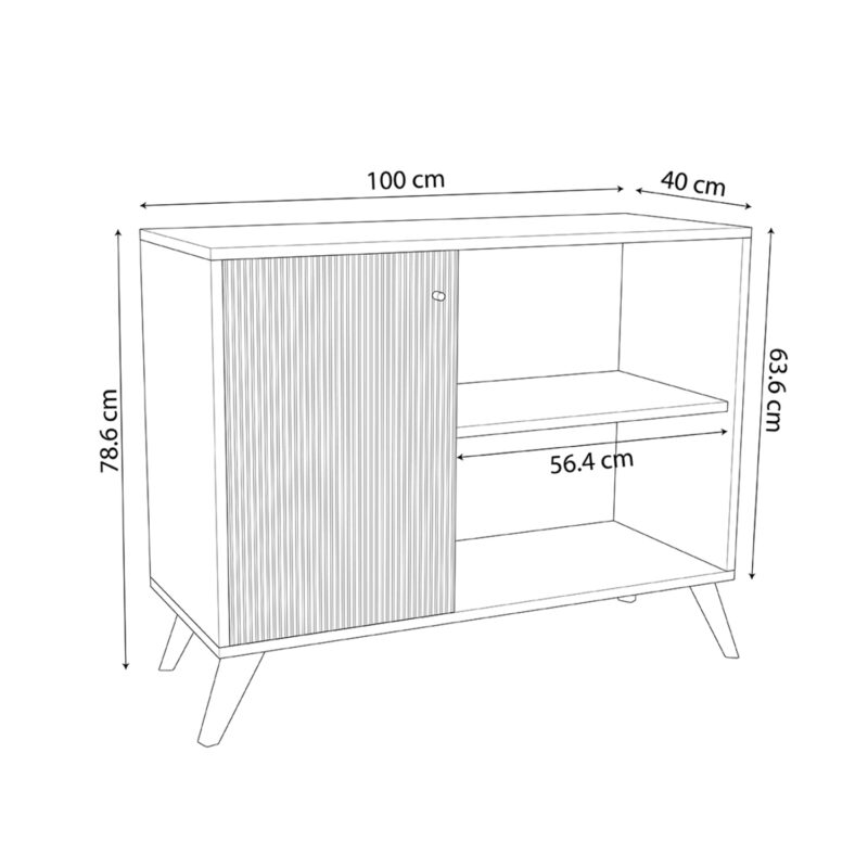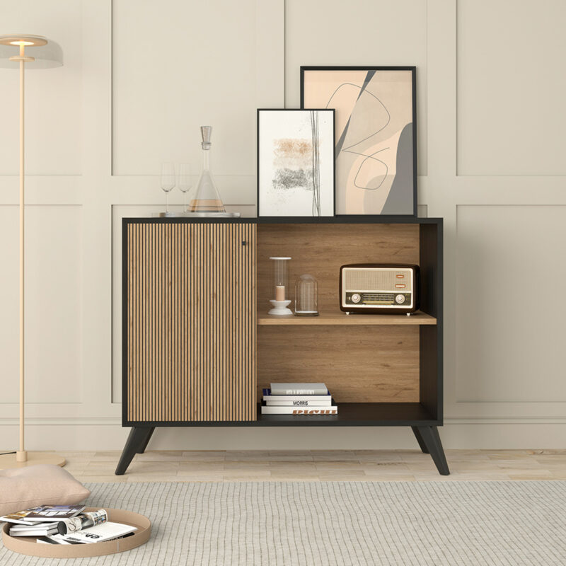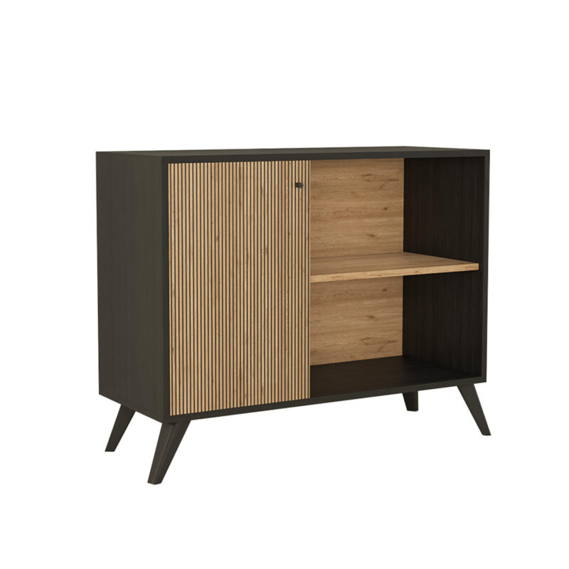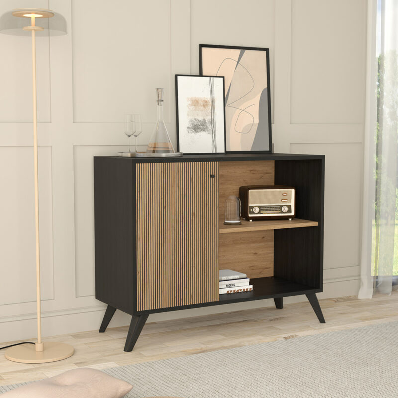 Черна конструкция с вратичка и рафт в натурален дървесен цвят