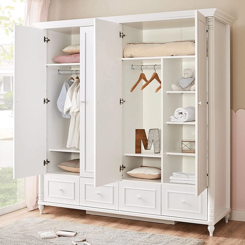 Големият четирикрилен гардероб от нашата бебешка колекция предлага максимално удобство и функционалност за всяка детска стая. Със своите четири чекмеджета и разнообразни отделения, той предоставя идеално организирано пространство за дрехи и аксесоари. Изработен от висококачествени ПДЧ и МДФ материали, гардеробът съчетава стил и издръжливост. Открийте повече за размерите и характеристиките в раздел “Допълнителна информация”.