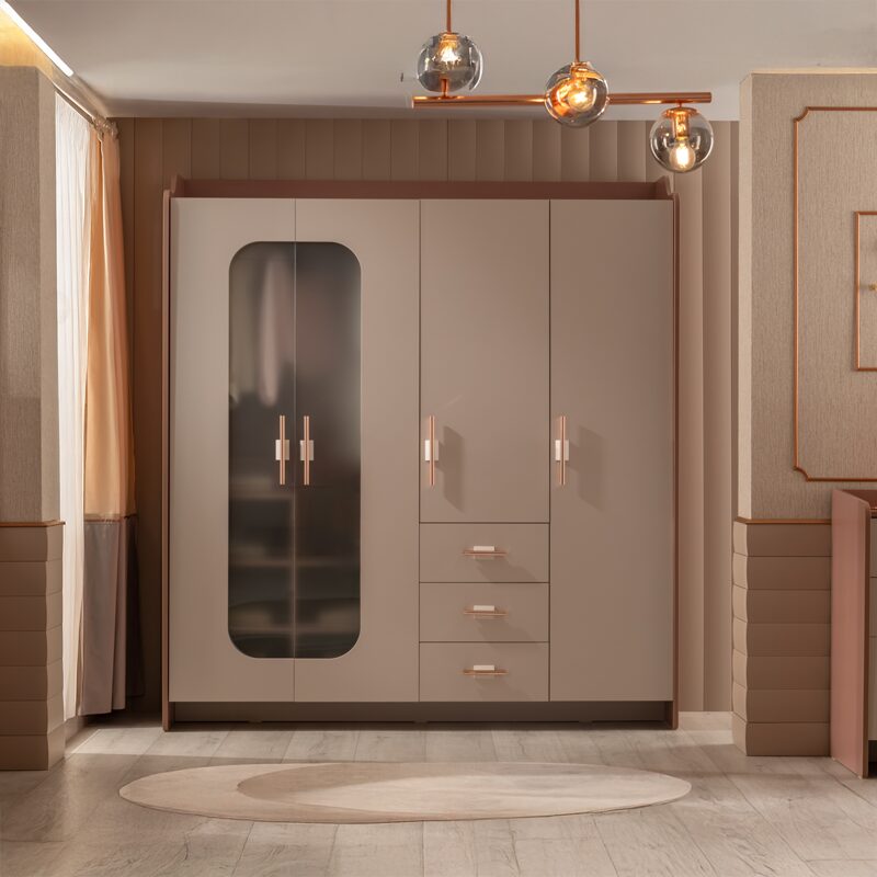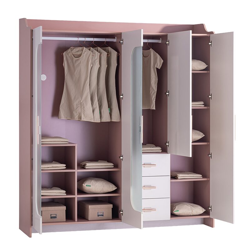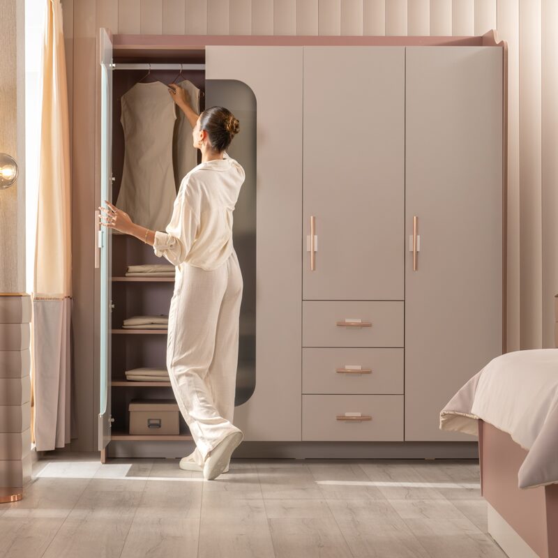 Четирикрилният гардероб ESTELLA предлага съвременен стил и практичност, като създава модерна атмосфера във вашия дом. Със стъклени врати и стилни акценти, този гардероб е идеален за младежки стаи и спални. Вътрешното пространство е интелигентно организирано с вградено LED осветление и вентилационна система за свежест. Изработен от висококачествени материали с E1 сертификат, гарантира безопасност и издръжливост.