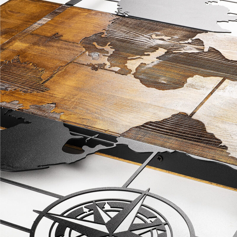 Уникален дизайн с черна карта на света, частично върху естествено дърво