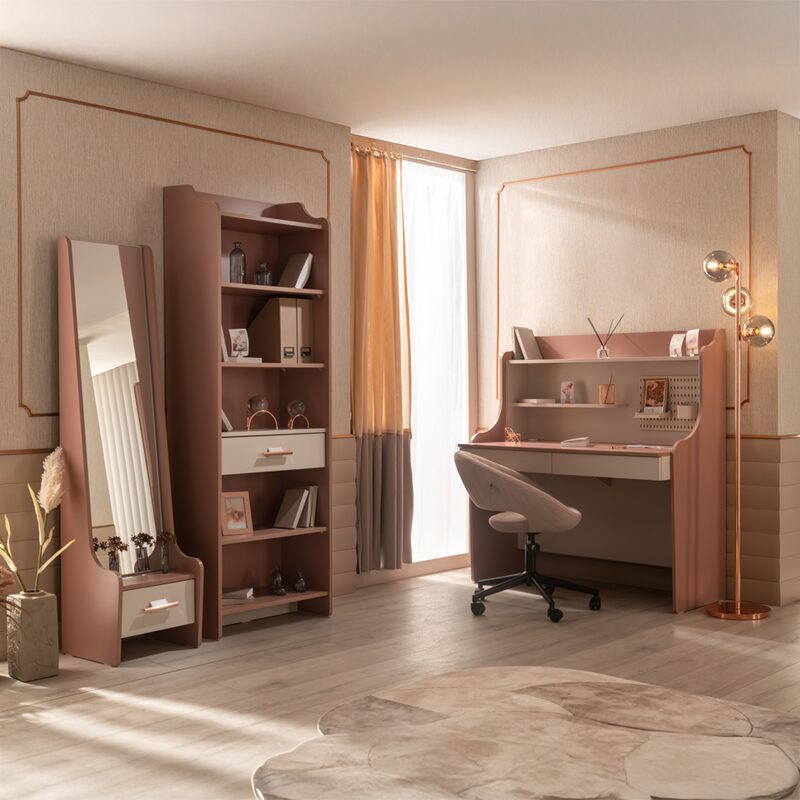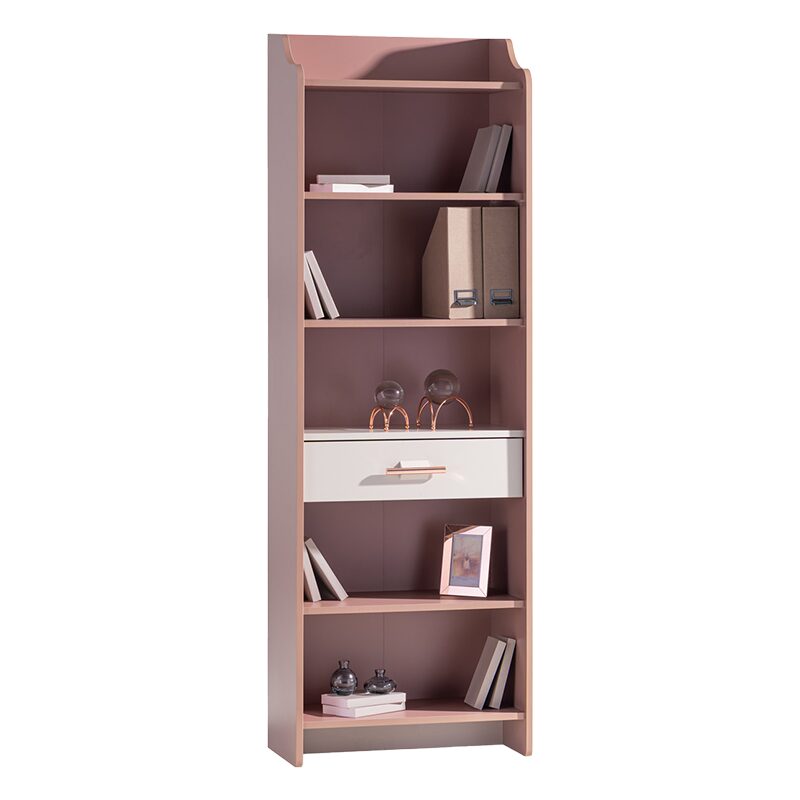 Детската етажерка за книги ESTELLA предлага стилно и практично решение за съхранение в детската стая. С шест просторни рафта и функционално чекмедже с плавно затваряне, тя осигурява оптимална организация на книги и аксесоари. Изработена от висококачествено ПДЧ, етажерката е здрава и устойчива, поддържайки до 25 кг на рафт. Елегантната розово-златиста дръжка добавя финален щрих на изисканост.
