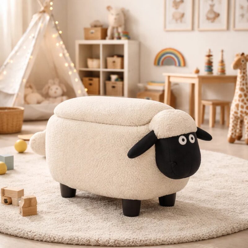 Тази очарователна детска табуретка с форма на овца е перфектното допълнение за стаята на вашето дете, предоставяйки комфорт и стил. Изработена от висококачествена, мека дамаска, тя впечатлява със своите мили очи и скрита ракла за съхранение на играчки. Идеалният избор за уют и организация в детската стая.