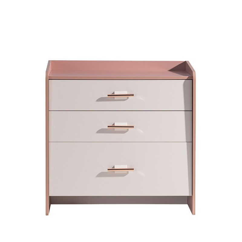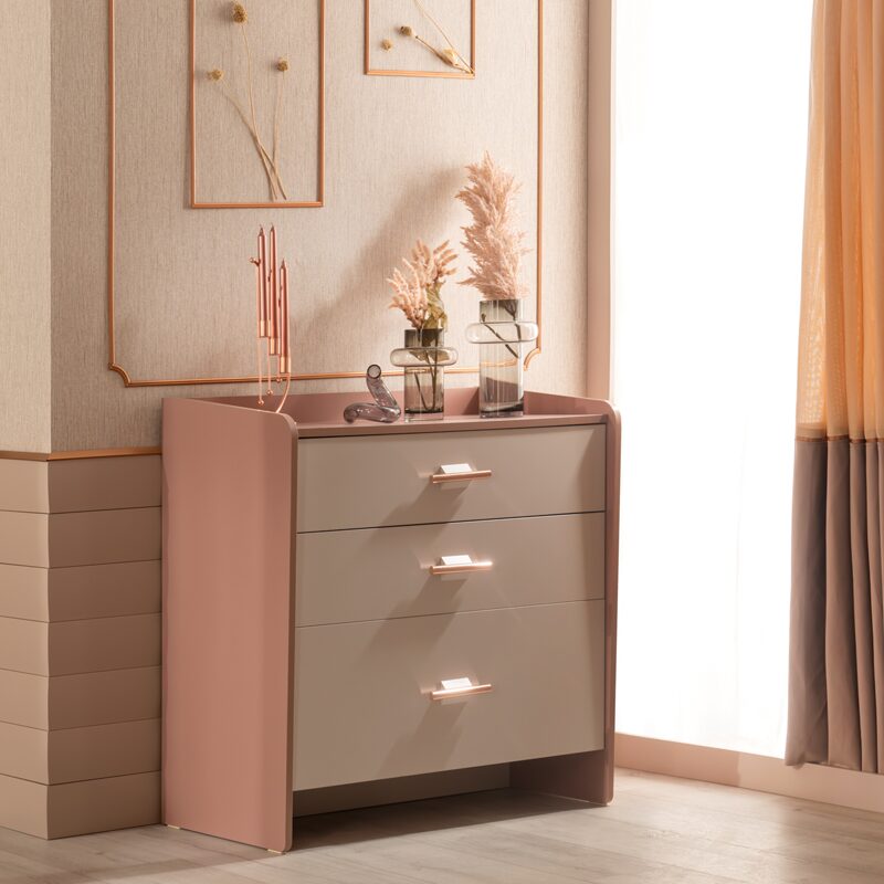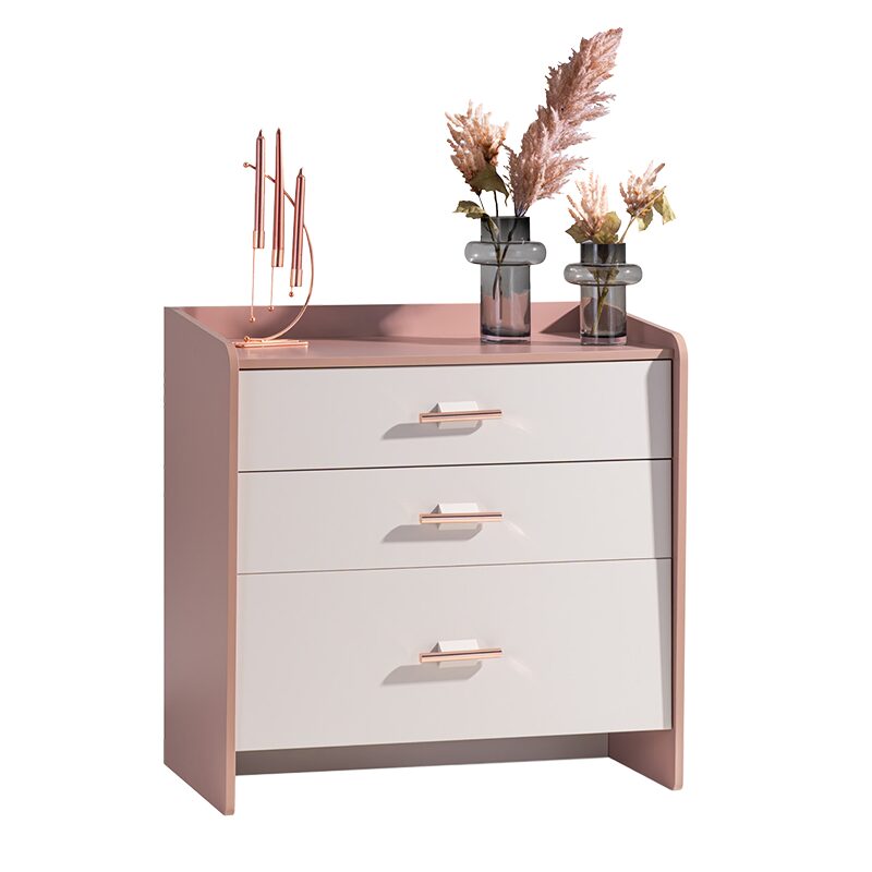 Перфектният избор за детската стая, детският скрин ESTELLA предлага функционалност и елегантност с три просторни чекмеджета за организиране на дрехи и аксесоари. Изработен от висококачествено ПДЧ, скринът е снабден с розово-златисти дръжки и система за плавно затваряне, осигуряваща тишина и безопасност. Насладете се на стил и удобство с този изискан мебелен акцент.