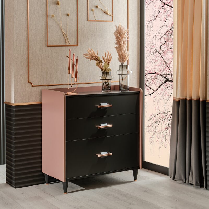 Детският скрин за дрехи VALENCIA предлага стил и практичност за вашето дете. С три чекмеджета, включително по-дълбоко долно за обемни дрехи, скринът осигурява удобно съхранение. Изработен от висококачествен 18 mm ПДЧ материал, той гарантира стабилност и дълготрайност. Механизмът с плавно затваряне и краката от ABS с rose gold детайли добавят безопасност и лесно почистване.