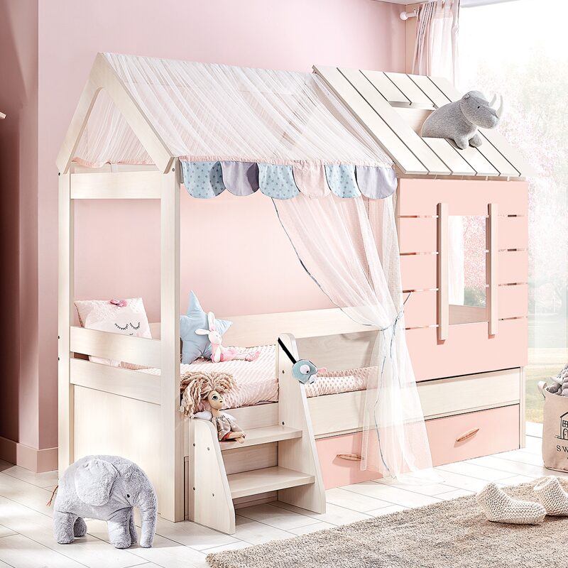 Детското легло от серията PINK HOUSE предлага идеалния уют за сънища и приключения на вашето дете. Със своя уникален дизайн, наподобяващ горска къщичка, и издръжлива конструкция от ПДЧ, то осигурява комфорт и безопасност. Лесният достъп с две стъпала насърчава независимостта. Перфектно за игри през деня и спокойни нощи, това легло е мечта за всяко дете.