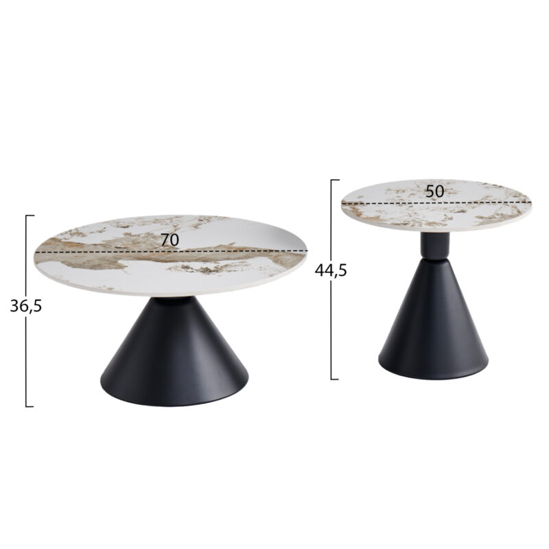 Различни размери с конусовидни основи в черно и гланцирани плотове от синтерован камък в цвят “пандора”