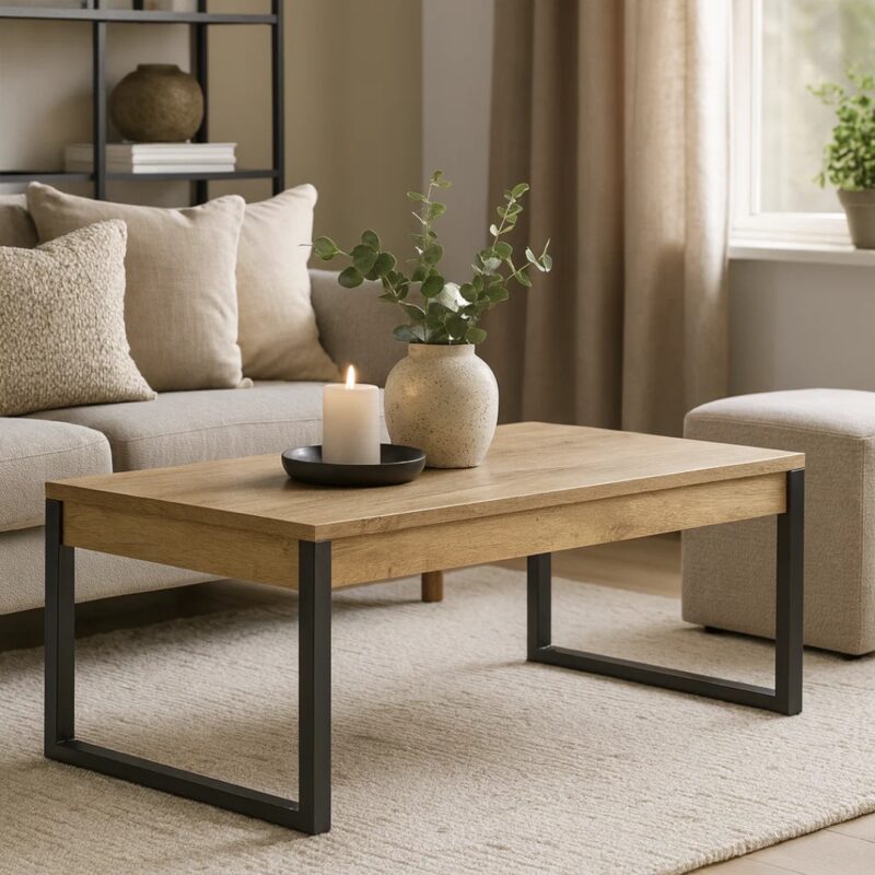 Холната маса LUND е идеалното решение за вашия модерен дом, съчетавайки елегантност и функционалност. Изработена от висококачествен МДФ с PVC фолио в топъл дъбов декор, тя придава естествено и стилно излъчване. Стабилната метална основа с прахово покритие добавя индустриален акцент, който перфектно допълва скандинавски и съвременни интериори. Разгледайте таблицата в “Допълнителна информация” за повече детайли.