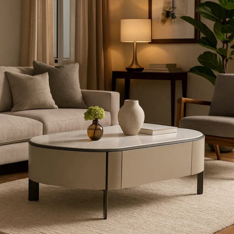 Холната маса PALMER предлага елегантност и стил, съчетавайки модерни линии и висококачествени материали. Керамичният плот добавя лукс, докато заоблените контури я правят универсална за всякакви интериори. Основата от МДФ и металните крака осигуряват стабилност, а двете чекмеджета от борова дървесина предоставят практично съхранение. Открийте повече в “Допълнителна информация”.