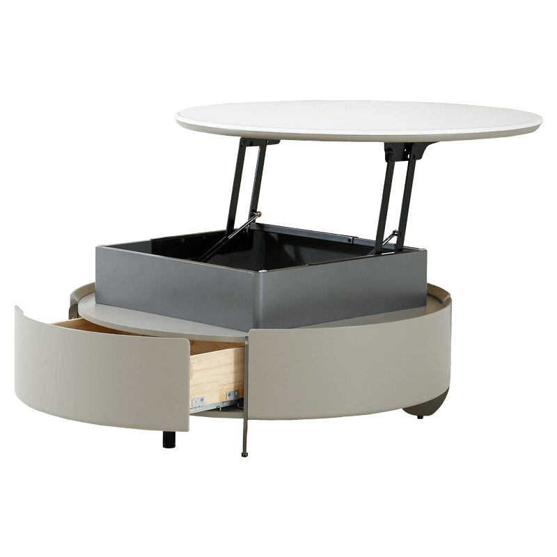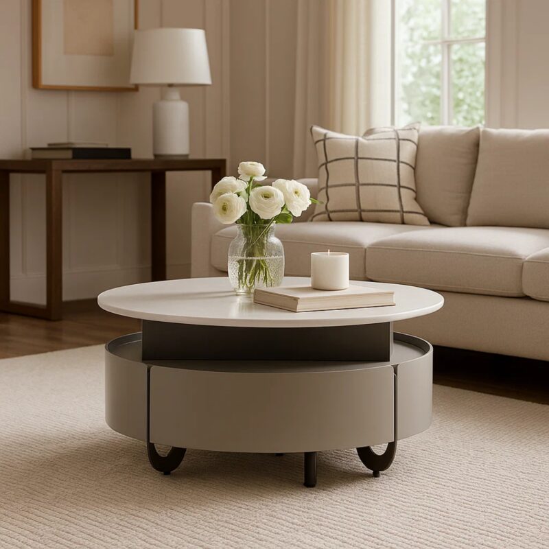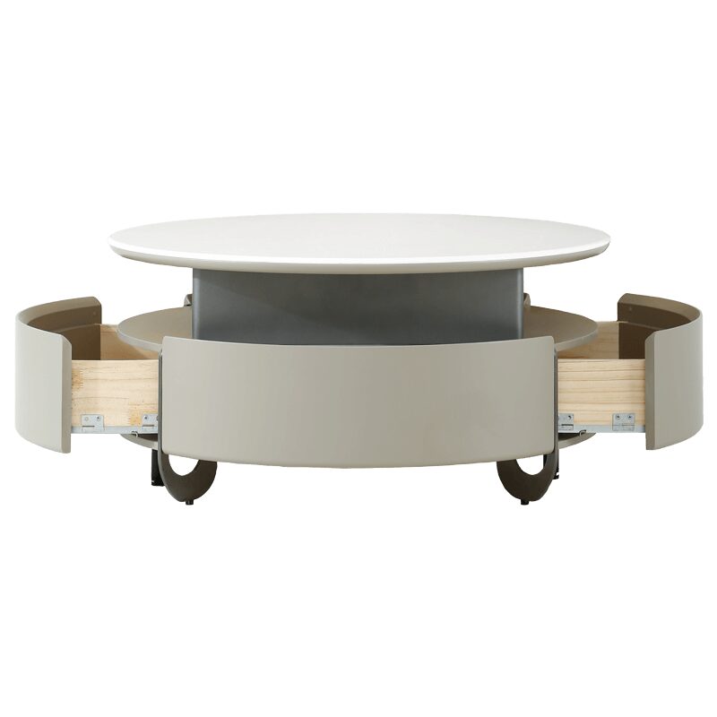 Холната маса TARIA е перфектното съчетание на стил и функционалност за вашата модерна дневна. С елегантен кръгъл керамичен плот и основа от МДФ в цвят капучино, тя предлага скрито отделение и две плавно отварящи се чекмеджета от борова дървесина. Насладете се на изискан дизайн и практичност в едно.