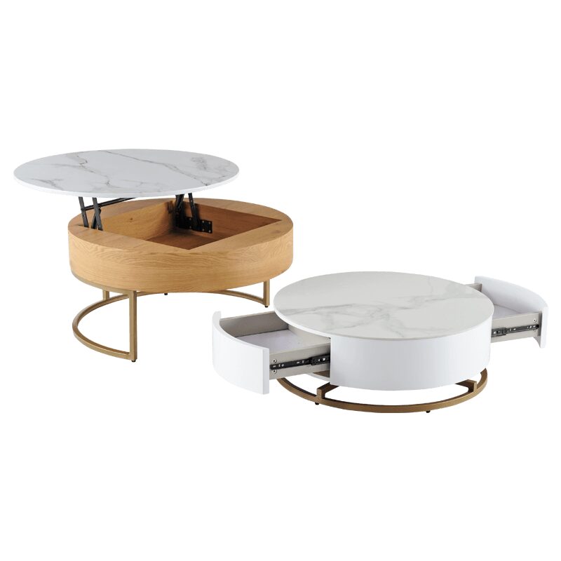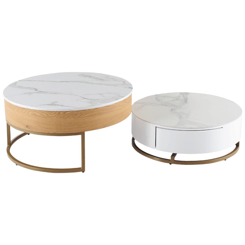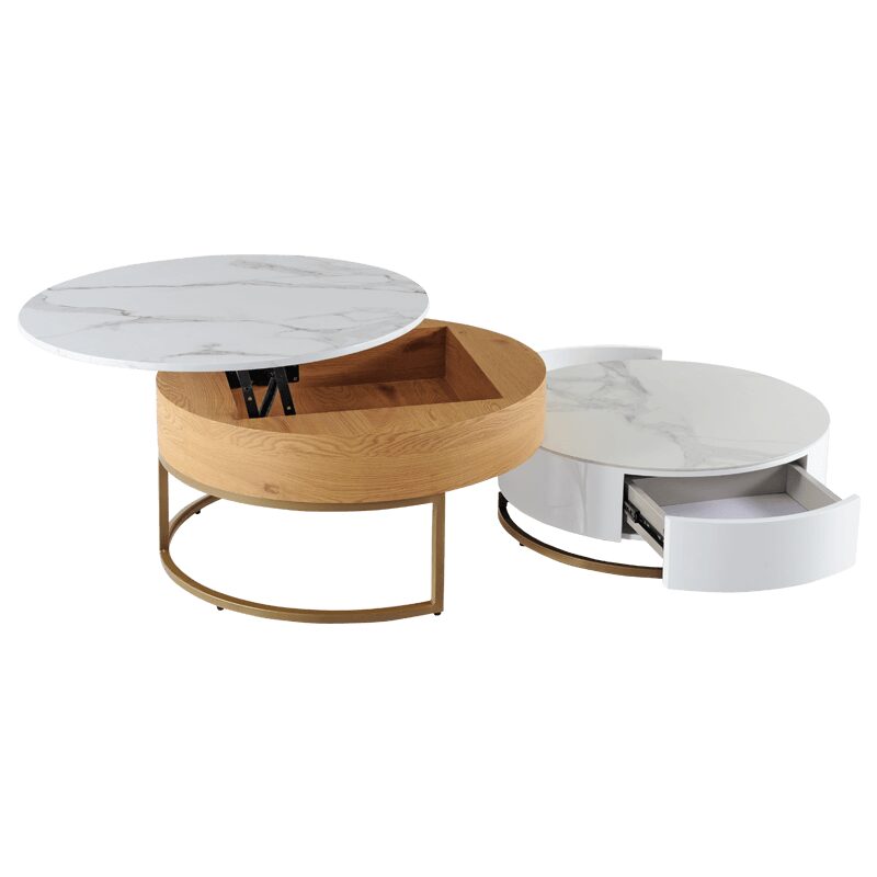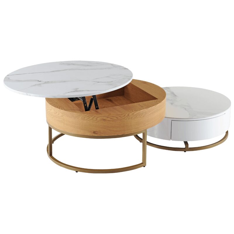 Комплектът от 2 холни масички TAMPA 1 е идеалното допълнение за вашия модерен интериор, съчетавайки стил и функционалност. Със здрава основа от праховобоядисан метал в златист цвят и плотове от МДФ и керамика, тези масички предлагат издръжливост и елегантност. Практичната повдигаща функция и компактните чекмеджета осигуряват удобно съхранение, което прави тези холни масички отличен избор за всяка всекидневна.