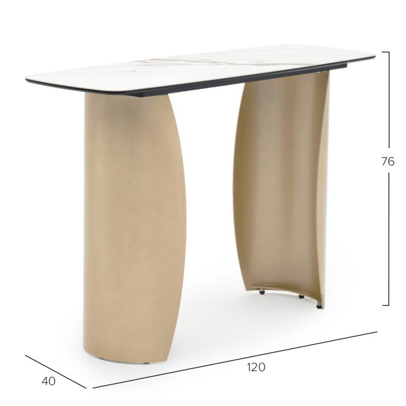 Керамичен плот с вид на бял мрамор, ламиниран с 8мм стъкло, метална рамка и крака в цвят шампанско