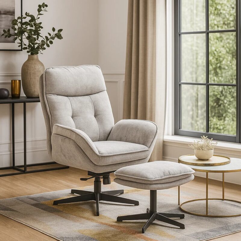 Насладете се на върховен комфорт с креслото ANDREA, което съчетава стил и функционалност. Люлеещата функция и включената табуретка гарантират релаксация, докато меката тапицерия и изчистеният дизайн добавят елегантност. Здравата метална основа осигурява стабилност до 130 кг. Подробности за размерите и характеристиките ще намерите в раздела “Допълнителна информация”.