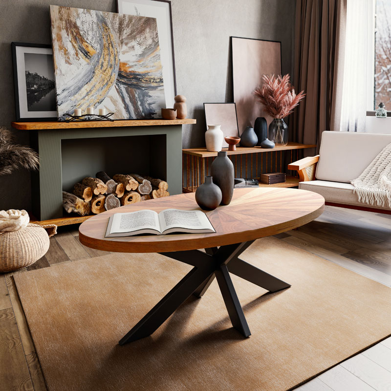Индустриален дизайн с топлите нюанси на акациева дървесина и черен метал