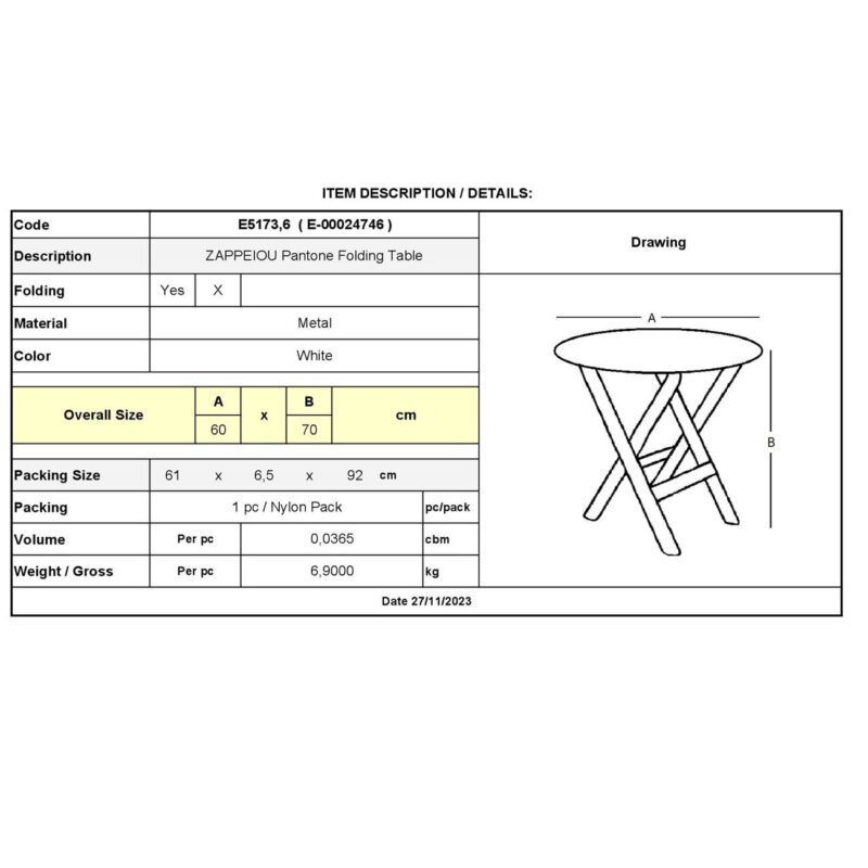 Маса, Pantone Folding Table, Бял, Метал, 60х70см.