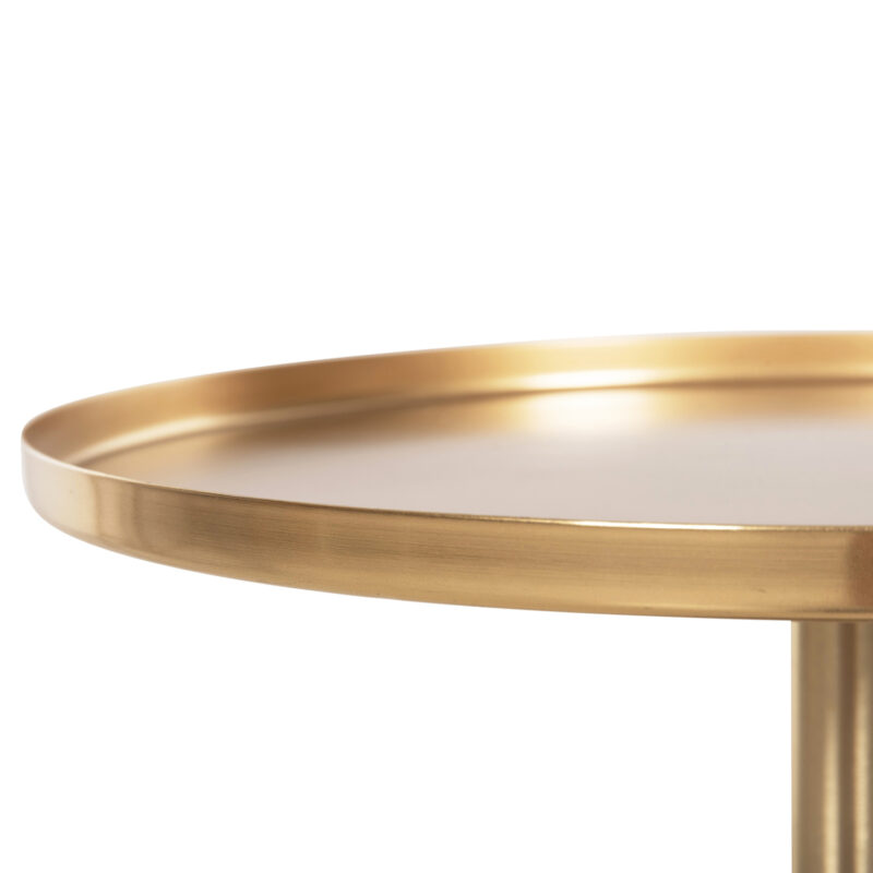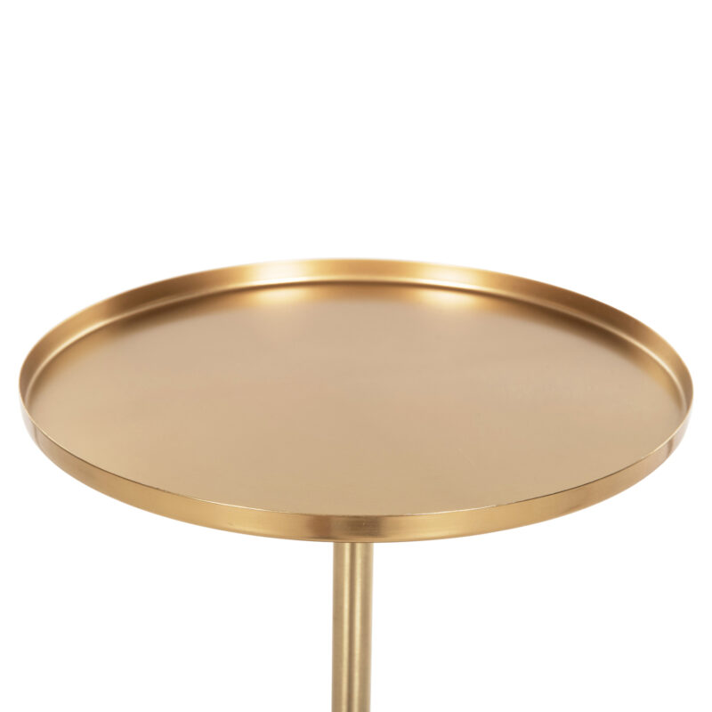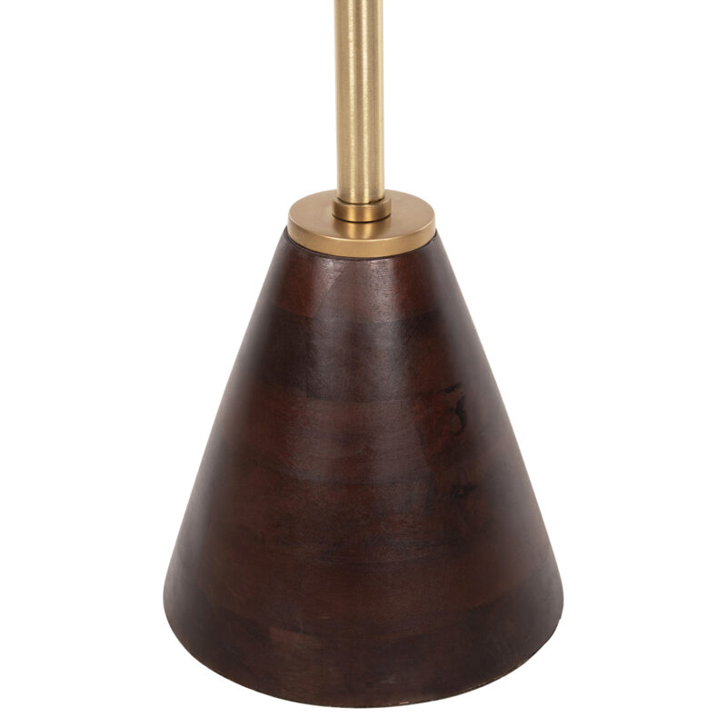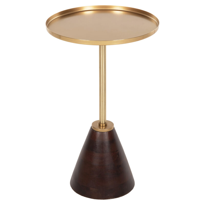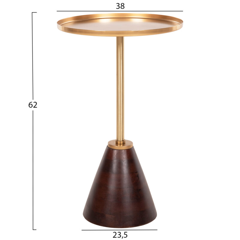 Заоблен плот от златист метал и конусна основа от мангово дърво в орехов цвят