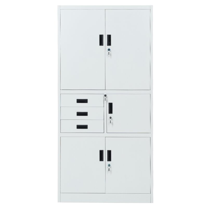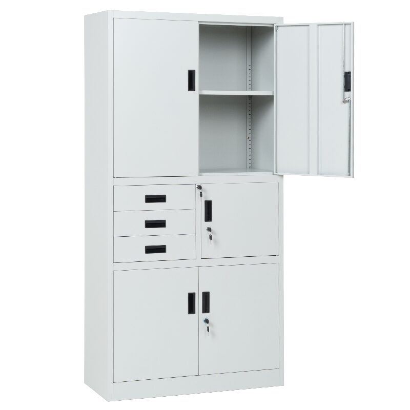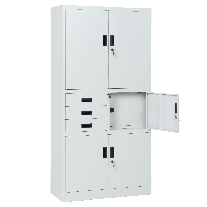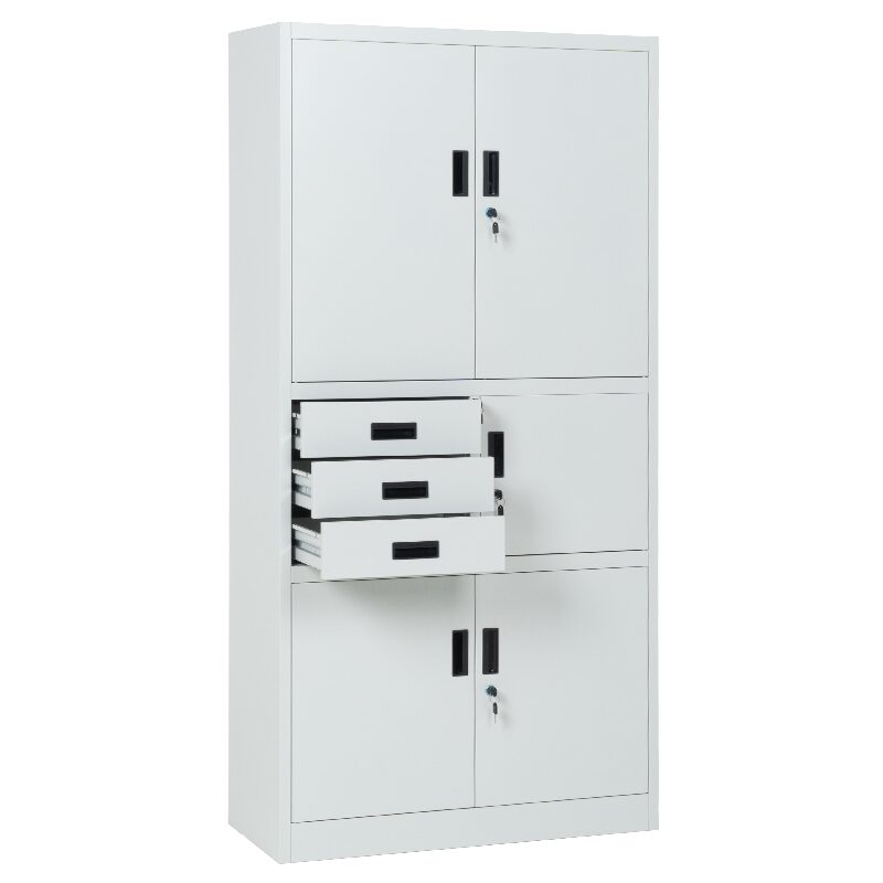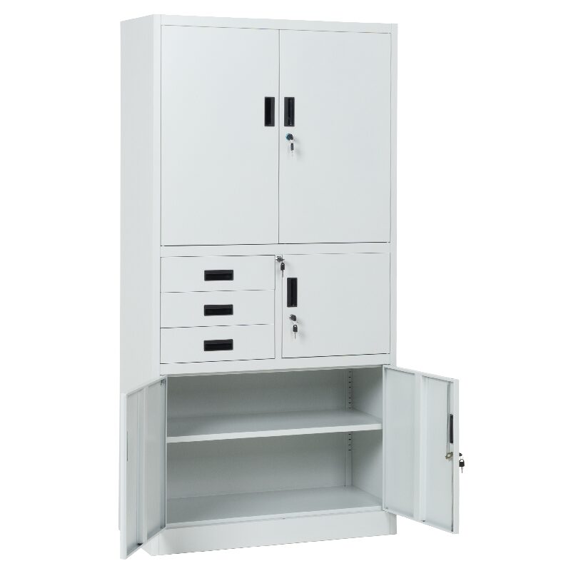 Насладете се на сигурност и организация с металния шкаф CR-1281 E K, идеален за съхранение на документи. С две отделни шкафчета, три чекмеджета с общо заключване и вграден сейф, този шкаф предлага гъвкавост и защита. Изработен от висококачествен праховобоядисан метал, той съчетава здравина и стил. Регулируемите рафтове осигуряват максимално удобство. Разгледайте размерите и характеристиките в “Допълнителна информация”.