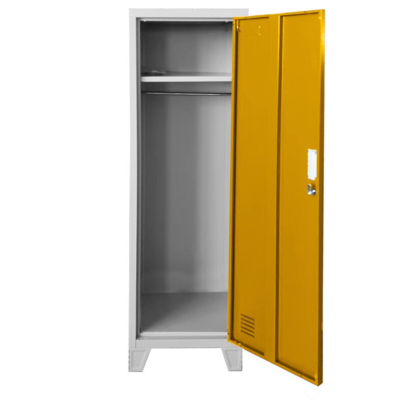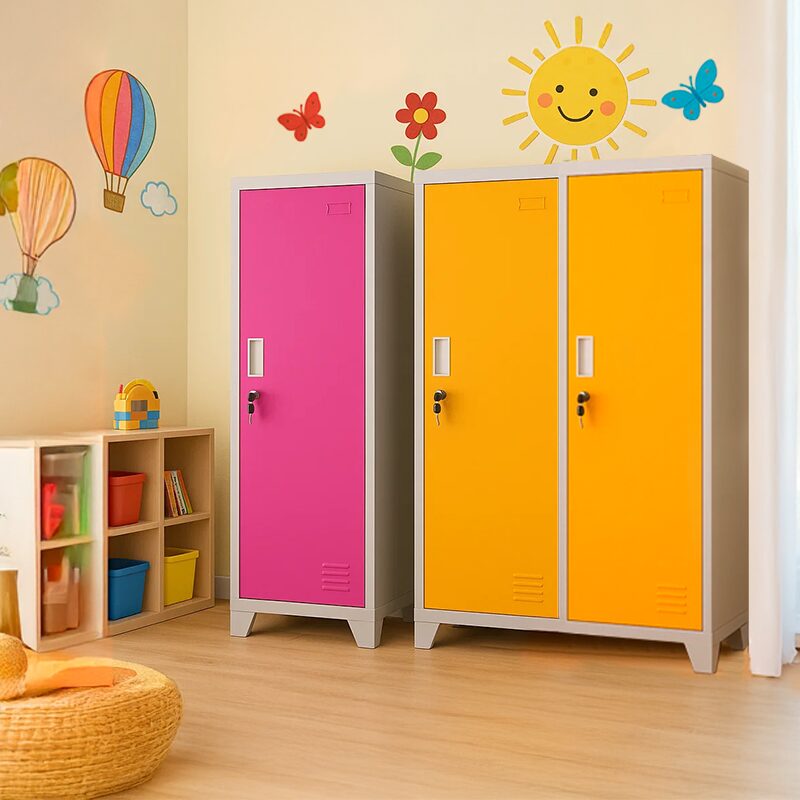 Металният шкаф CR-1604-1 JZ е идеалното решение за сигурно съхранение с плътна врата и ключалка. Изработен от висококачествен праховобоядисан метал с грапаво-шагрен покритие, той предлага надеждност и стил. С товароносимост до 40 кг, вграден лост за закачалки и вентилационен отвор, този шкаф е перфектен за детски градини. Предлага се в светлосив цвят с акценти в розово, синьо или оранжево.