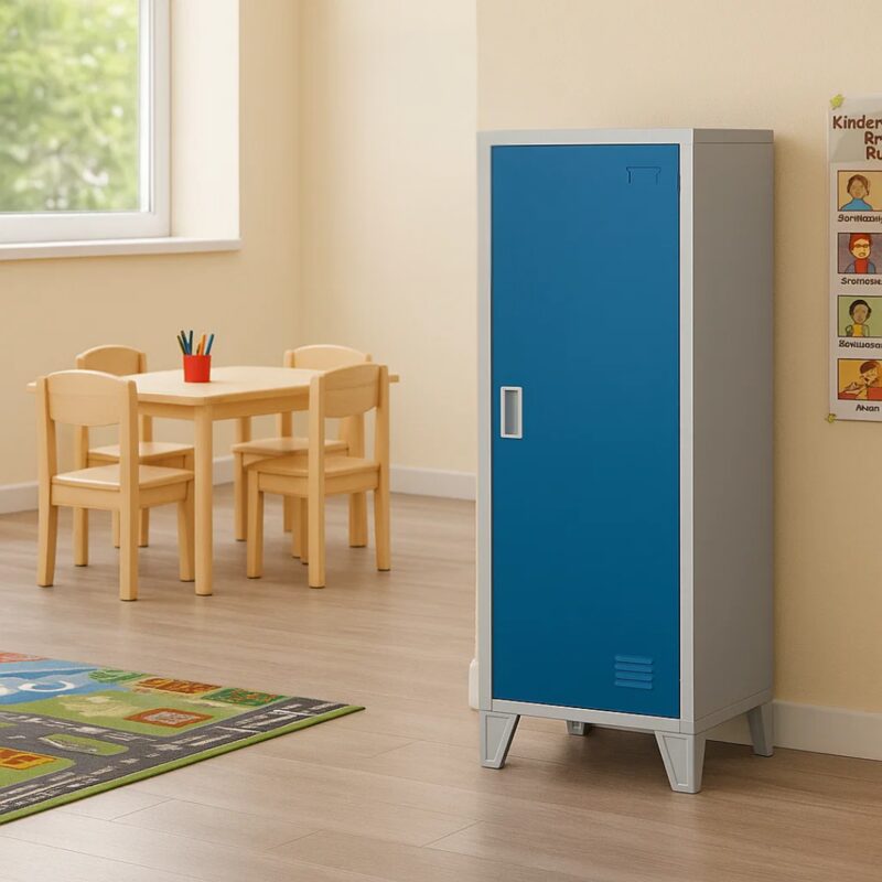 Металният шкаф CR-1605-1 JZ предлага оптимално съхранение с издръжливост до 40 кг и удобен вграден лост за закачалки. Изработен от висококачествен праховобоядисан метал, този шкаф с магнитно затваряне и вентилационен отвор осигурява отлична циркулация на въздуха. Идеален за детски градини, неговите 10 см крака улесняват почистването. Научете повече в ‘Допълнителна информация’.