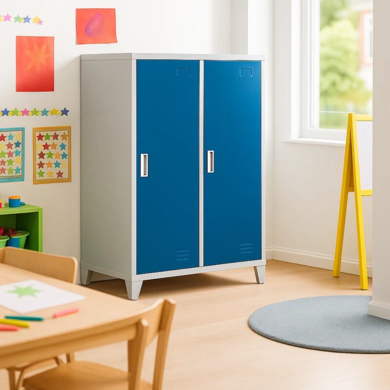 Изберете метален шкаф CR-1605-2 JZ за надеждно и стилно съхранение. С две плътни врати и магнитна система, този шкаф предлага сигурност и удобство. Изработен от висококачествен праховобоядисан метал, с грапаво-шагрен покритие, той е идеален за детски градини. Вградените рафтове издържат до 40 кг, а вентилационните отвори осигуряват отлична циркулация на въздуха.