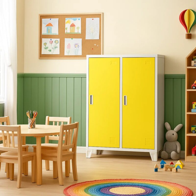 Метален шкаф CR-1605-2 JZ предлага практично решение за съхранение с двойни врати и магнитно затваряне. Изработен от висококачествен праховобоядисан метал с грапаво-шагрен покритие, този шкаф е идеален за детски градини. Вградените рафтове с товароносимост до 40 кг и лост за закачалки осигуряват удобство, докато вентилационният отвор гарантира добра циркулация на въздуха. Лесно почистване благодарение на 10 см крака.