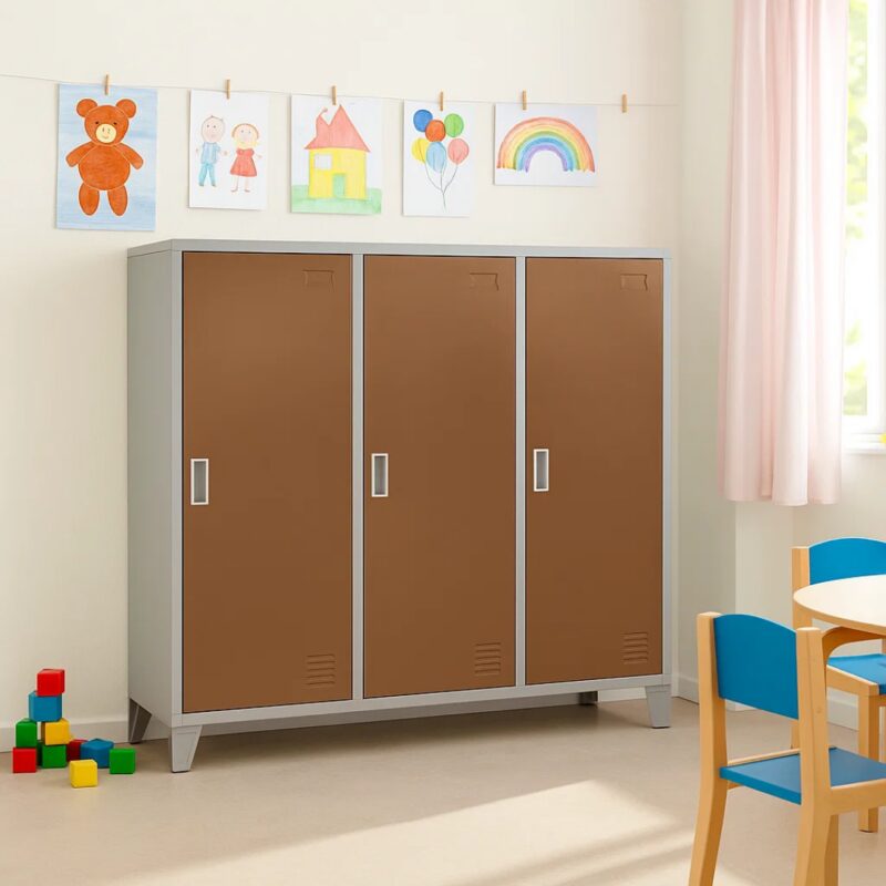 Металният шкаф CR-1605-3 JZ предлага изключителна функционалност с три отделения, всяко оборудвано с рафт, лост за закачалки и вентилационен отвор за оптимална циркулация на въздуха. Изработен от висококачествен праховобоядисан метал с грапаво-шагрен покритие, този гардероб е идеален за детски градини. Лесното почистване под шкафа е осигурено благодарение на 10-сантиметровите крака.