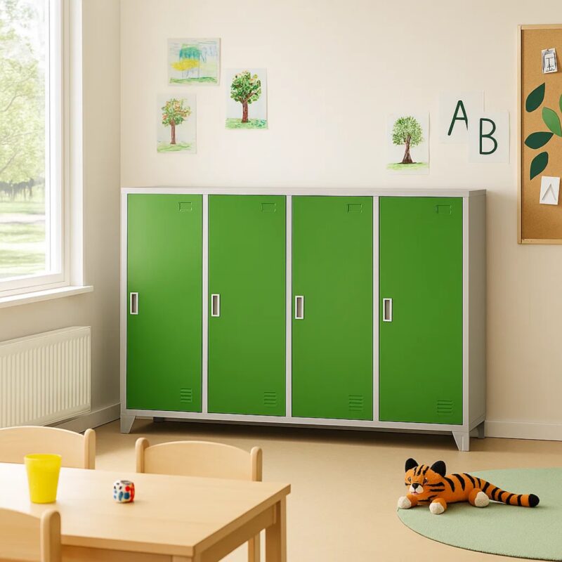 Металният шкаф CR-1605-4 JZ е идеалното решение за организиране на пространството с неговите четири отделения и магнитно затварящи се врати. Изработен от здрав праховобоядисан метал, този гардероб предлага издръжливост и стил. С вентилационни отвори и лост за закачалки, той е перфектен за детски градини. Лесно почистване благодарение на 10-сантиметровите крака.