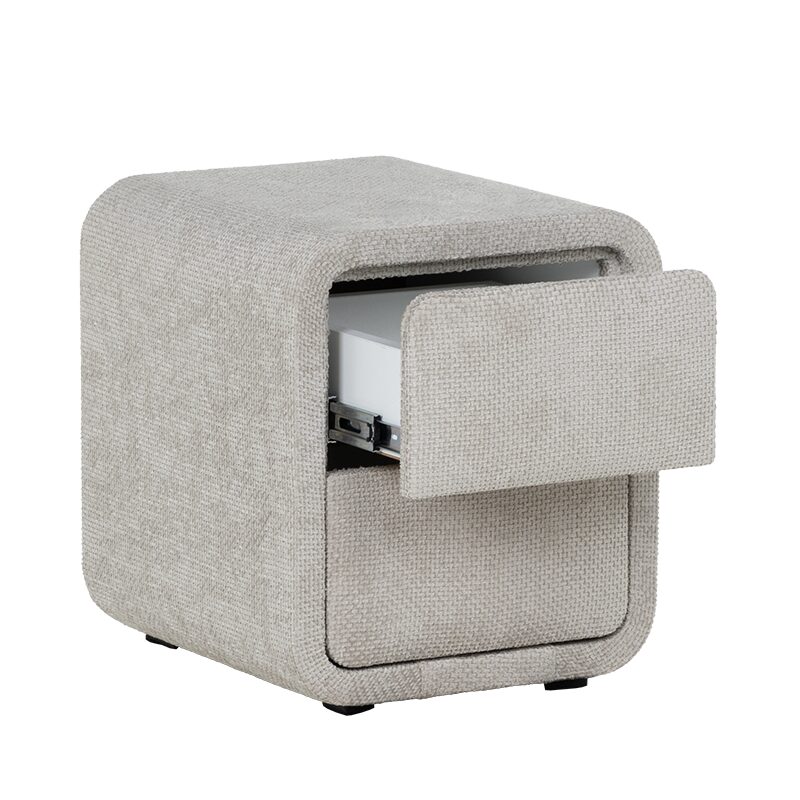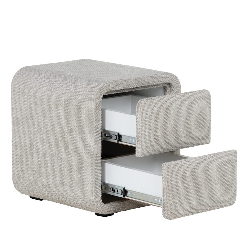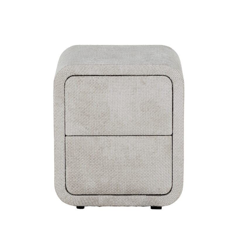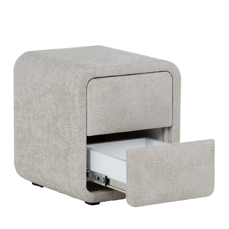 Добавете елегантност и функционалност към вашата спалня с нощното шкафче FABER в деликатен нюанс слонова кост. Със своите заоблени форми и висококачествена текстилна дамаска, това шкафче предлага уют и стил. Двете плавно отварящи се чекмеджета осигуряват практично съхранение на книги и аксесоари. Компактният му размер го прави перфектен избор за всяка модерна спалня.
