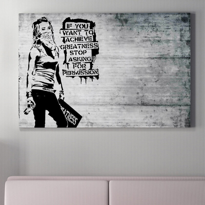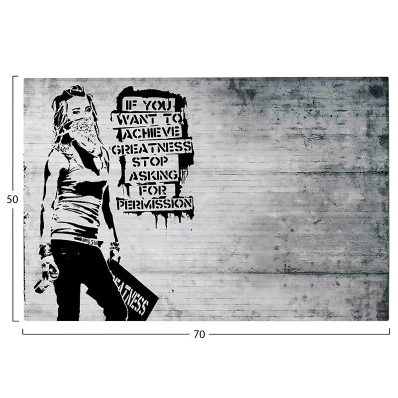 Изобразява стенен лозунг на дигитално отпечатано платно (50% памук-50% полиестер) в дървена рамка.