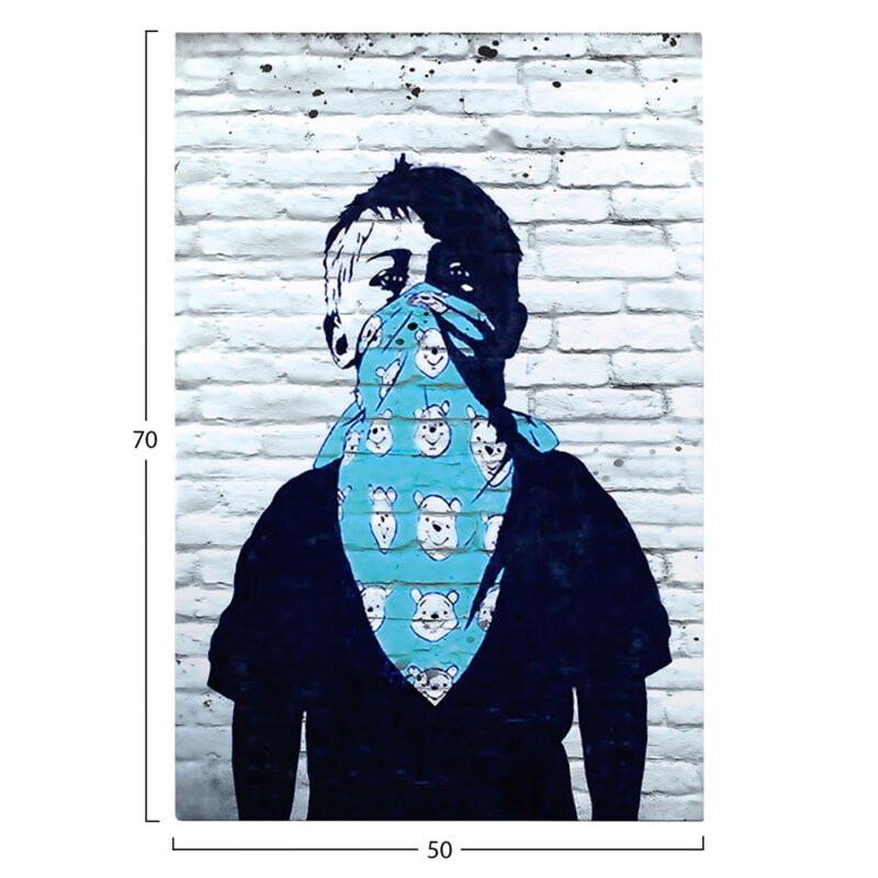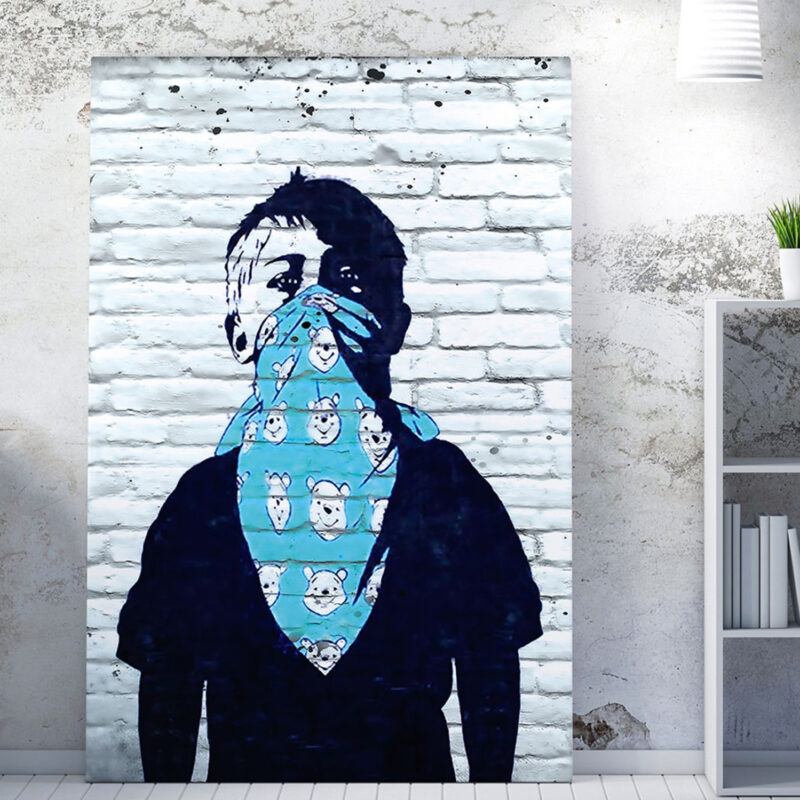 Изобразява дете с маска и шал, вдъхновено от Banksy