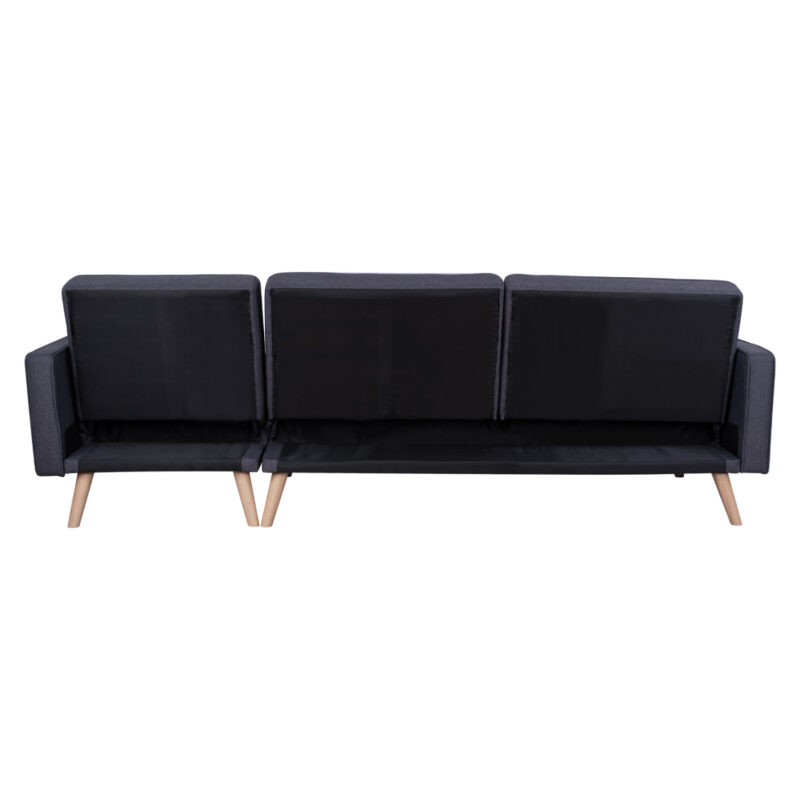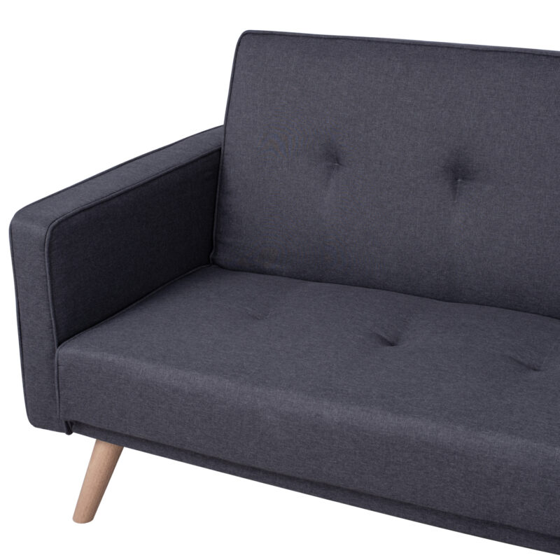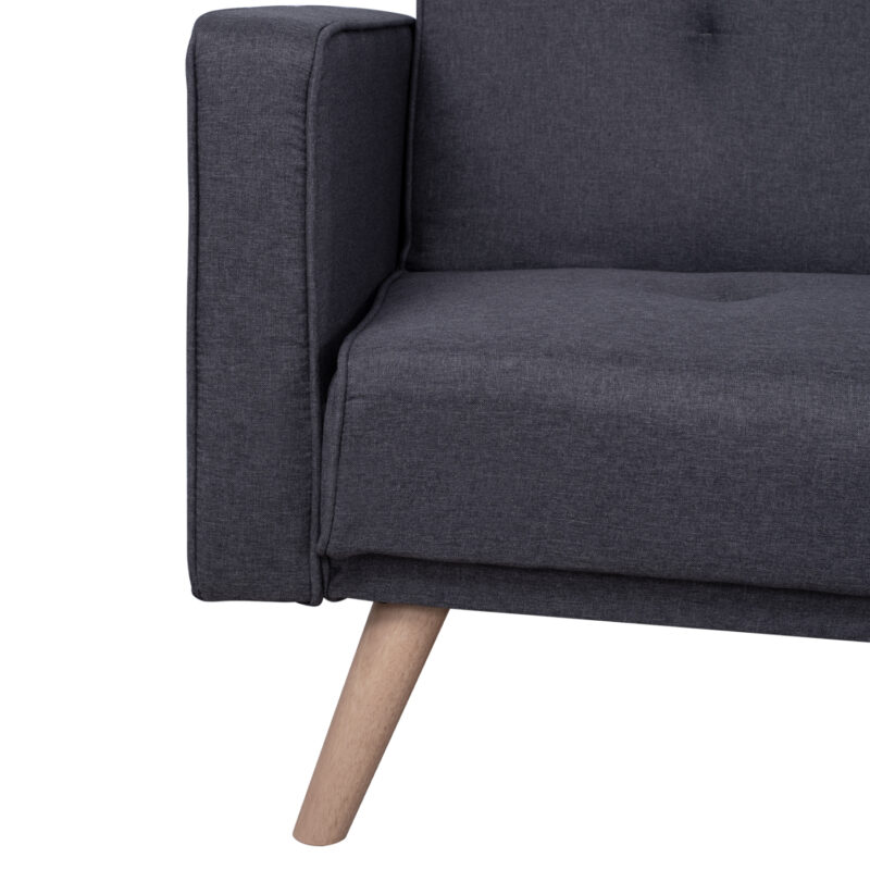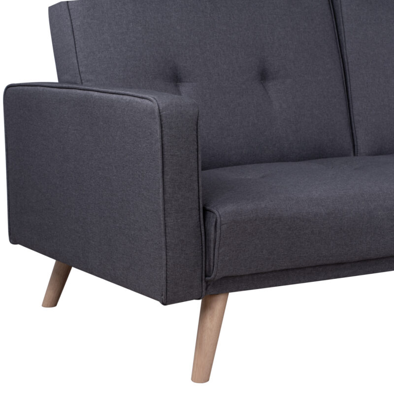 Краката на дивана са от дърво в естествен нюанс, а също така и гърбът му, който може да се накланя назад и лесно да се превръща в удобно легло.