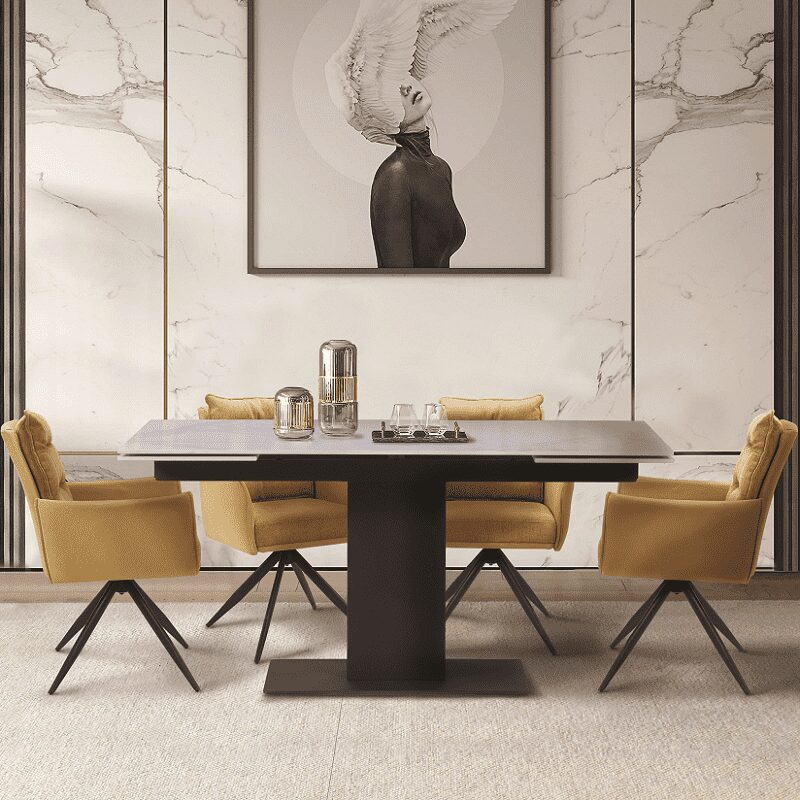 Открийте елегантността и функционалността на трапезната маса JURATA, създадена да внесе стил във вашия дом. Изработена от качествени материали, с керамичен плот и праховобоядисана метална основа, тази маса предлага стабилност и разширяемост. Със своя модерен дизайн, тя се вписва безпроблемно във всеки интериор. Разгледайте таблицата за допълнителна информация относно размерите и характеристиките.