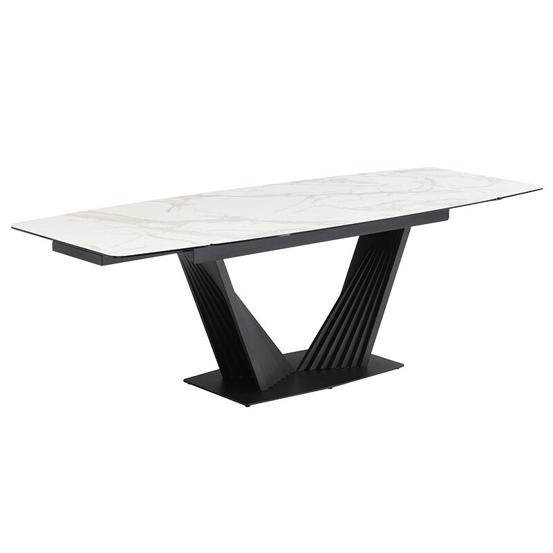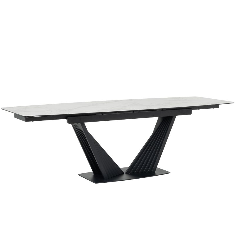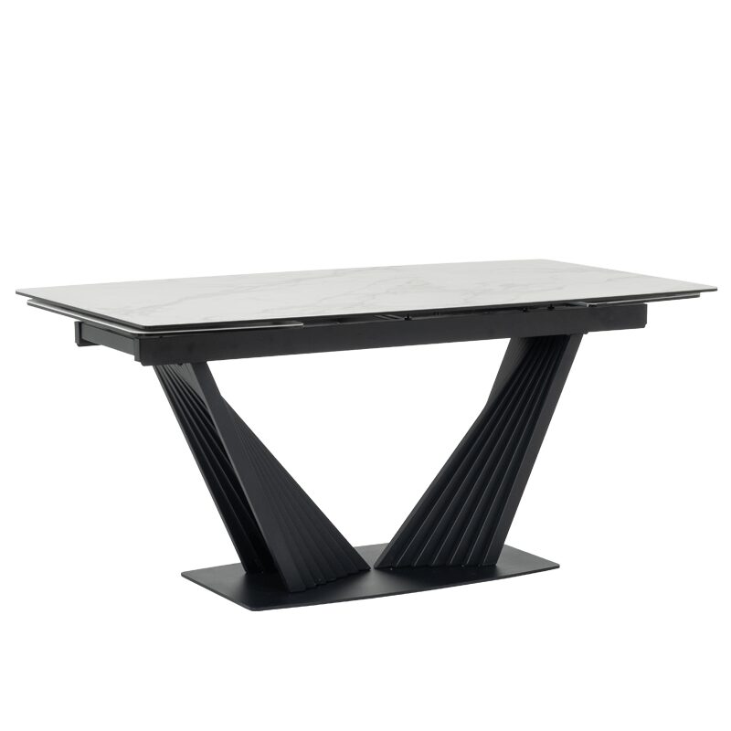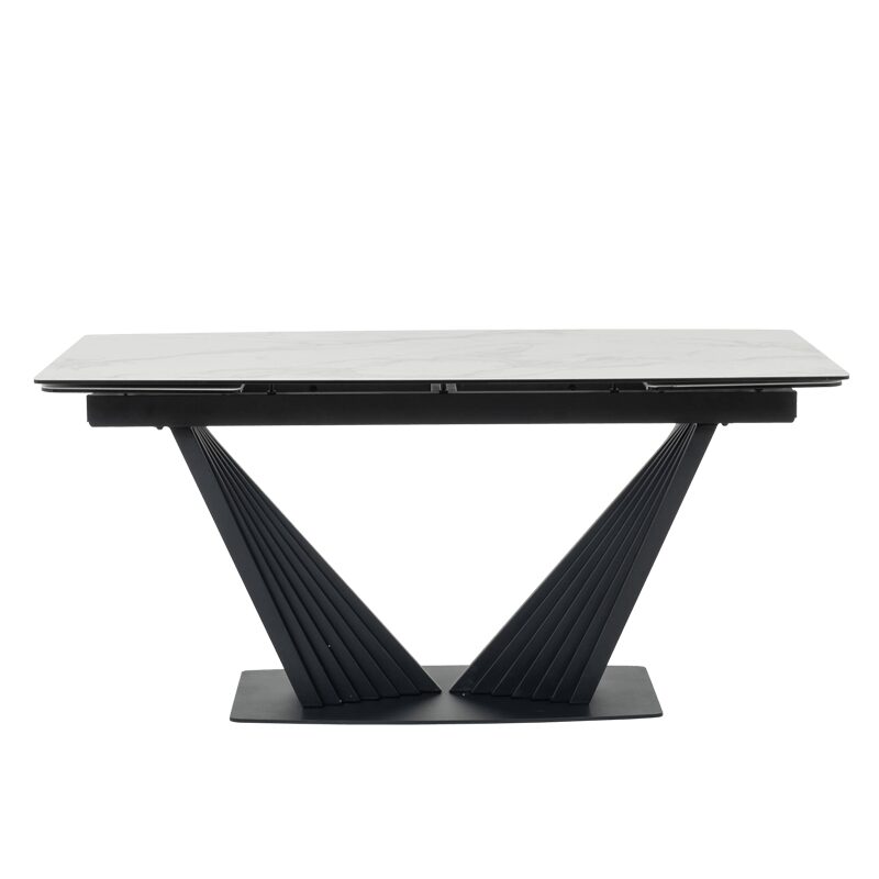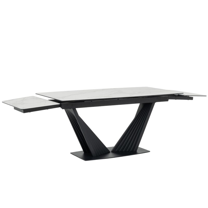 Трапезната маса LEGNICA е перфектният акцент за вашата модерна трапезария, съчетавайки стил и функционалност. С плот от закалено стъкло и керамика с мраморен ефект, тя излъчва елегантност и лукс. Уникалната V-образна основа придава стабилност, а иновативният релсов механизъм позволява лесно разтягане от 160 см до 240 см. Идеална за съвременния дом, където качеството е приоритет.