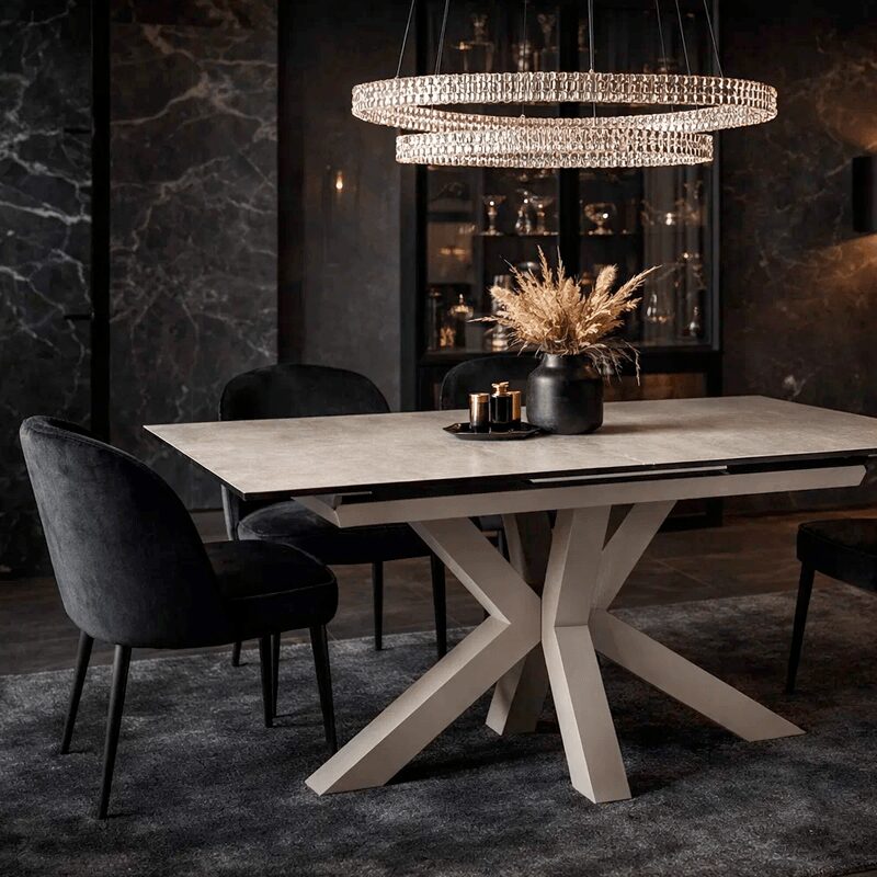Разтегателната трапезна маса STARGARD X е идеалното решение за стилен и функционален дом. Със своя иновативен дизайн и масивни крака, тя предлага впечатляваща визия и удобство. Керамичният плот със закалено стъкло и разтягаща функция увеличава дължината от 140 см до 180 см, осигурявайки допълнително пространство. Изработена от висококачествени материали, тази маса е перфектният избор за всяка трапезария.