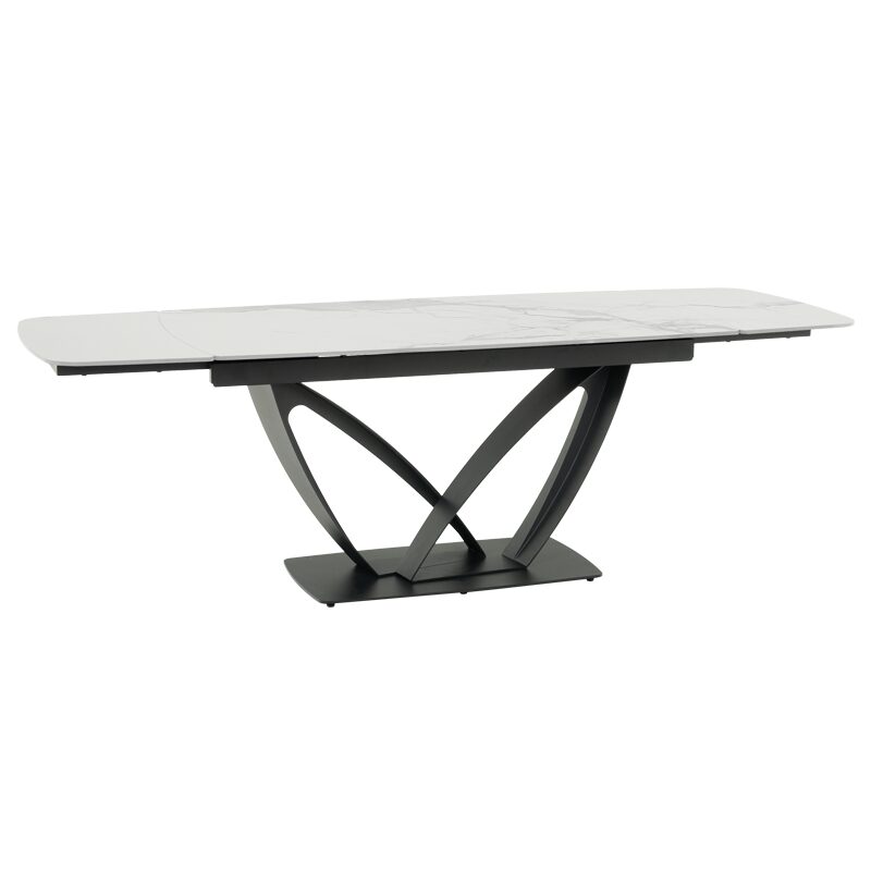 Насладете се на изискан стил и функционалност с трапезната маса TORUN. Със своя разтегателен механизъм, тя достига дължина от 240 см, идеална за събирания с приятели и семейство. Изработена от висококачествен праховобоядисан метал и керамичен плот с мраморен ефект, тази маса съчетава елегантност и издръжливост, което я прави перфектен избор за всяка модерна трапезария.