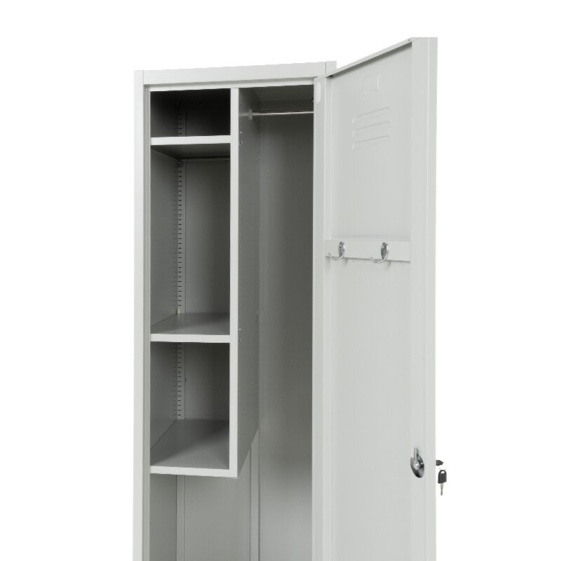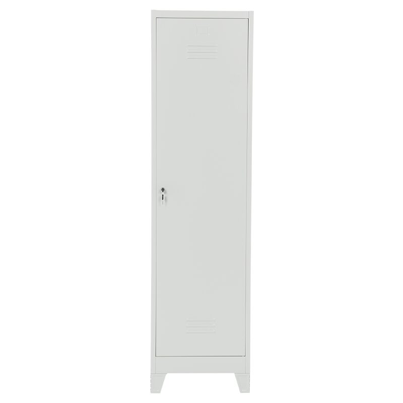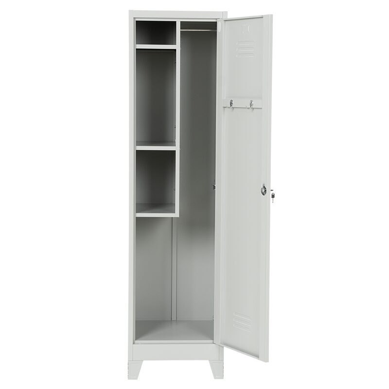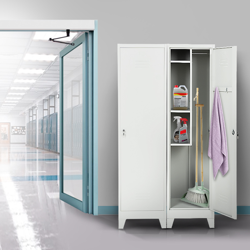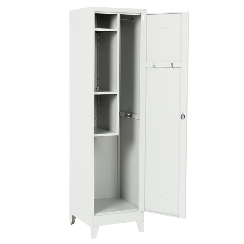 Металният санитарен шкаф CR-1284 E J е идеалното решение за организирано съхранение в офиси и санитарни помещения. Изработен от висококачествен праховобоядисан метал със светлосиво покритие, шкафът предлага три здрави рафта с товароносимост до 40 кг, лост за закачалки и два кукички. Вентилационният отвор осигурява свеж въздух, а заключващата се врата гарантира сигурност.