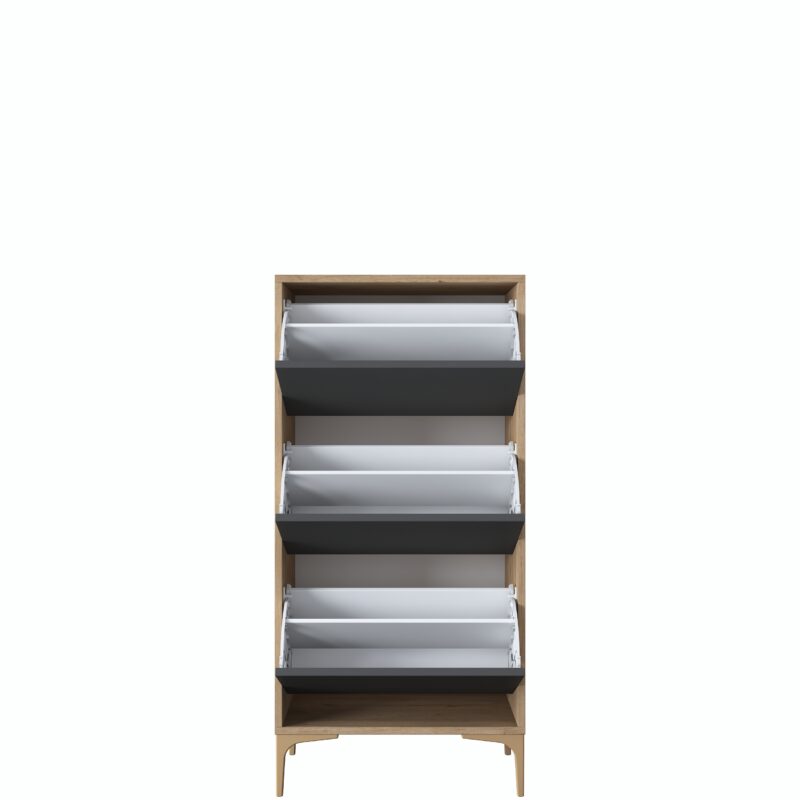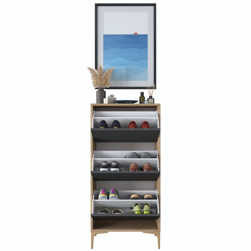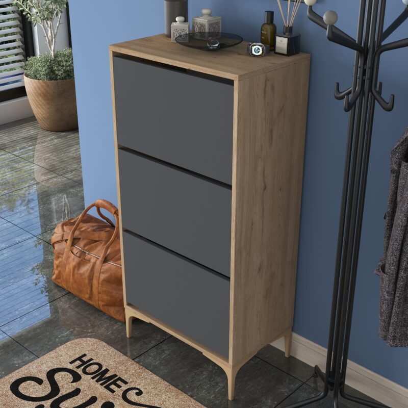Изработен в модерен цвят орех с антрацит, шкафът лесно се съчетава с различни интериорни стилове – от класически до индустриален.