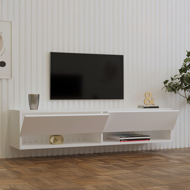 Дизайн: Модерен и минималистичен, с пространство за съхранение на аксесоари около телевизора, като дистанционни, конзоли и други лични вещи.