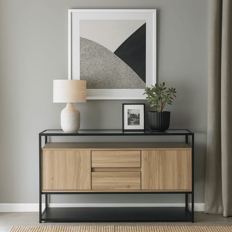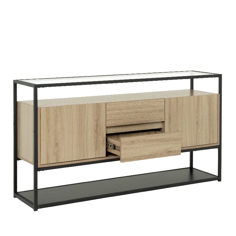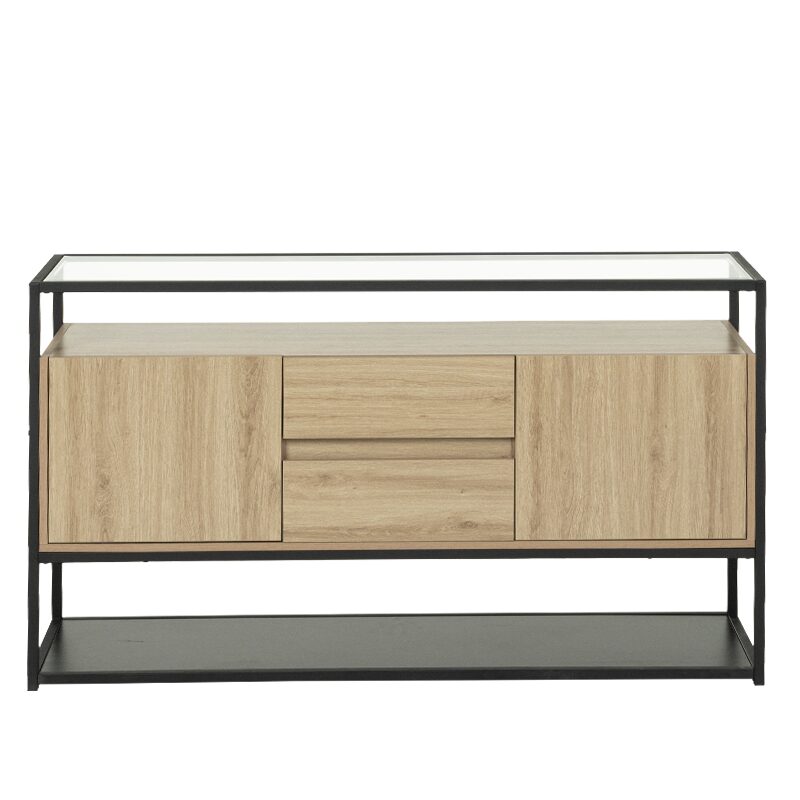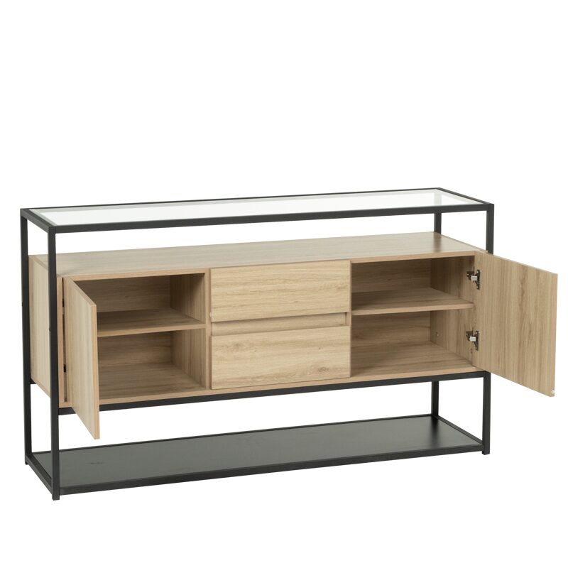 Скринът GAVLE предлага стил и функционалност в едно, идеален за съвременния дом. Съчетанието от здрава метална рамка с черно праховобоядисано покритие и МДФ с меламиново покритие в топъл дървесен нюанс осигурява издръжливост и естетика. Две чекмеджета и два шкафа с рафтове предлагат практично съхранение, а горният плот от закалено стъкло добавя изисканост.