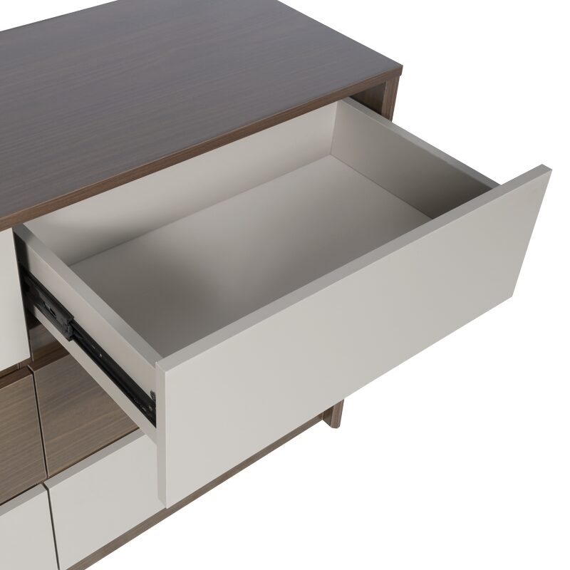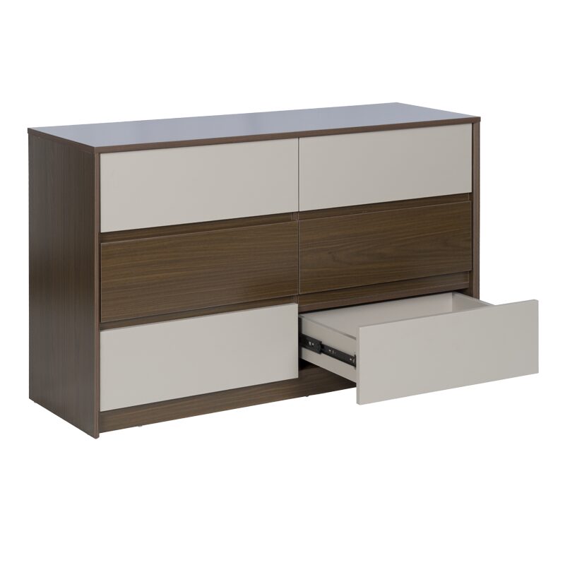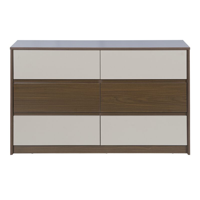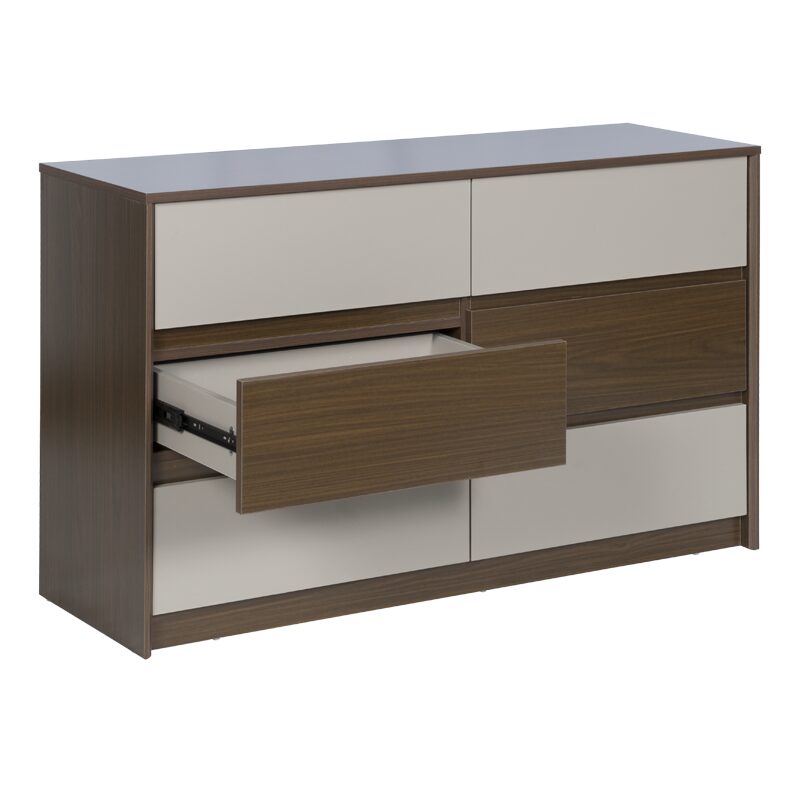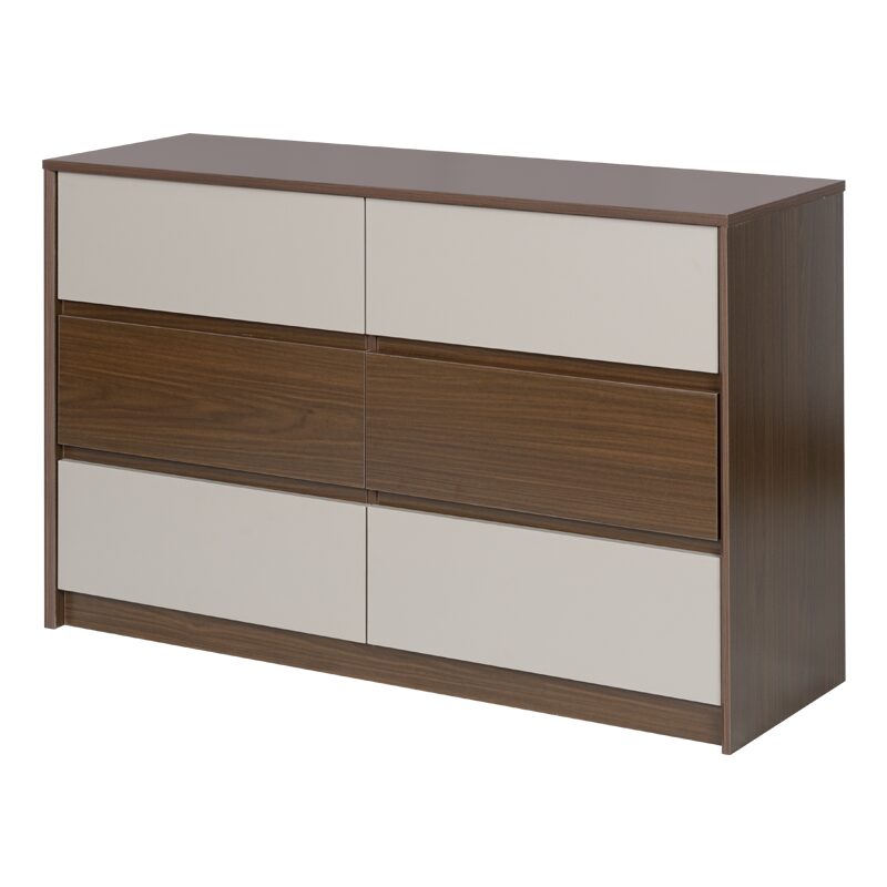 Скринът NAVOTAS е идеалното решение за стилно и ефективно съхранение у дома. Със своите шест просторни чекмеджета, той предлага изобилие от място за дрехи и аксесоари. Изработен от висококачествени ПДЧ и меламин, скринът впечатлява с елегантната си комбинация от топъл дървесен цвят и капучино нюанс, добавяйки уют и хармония във всяка стая.