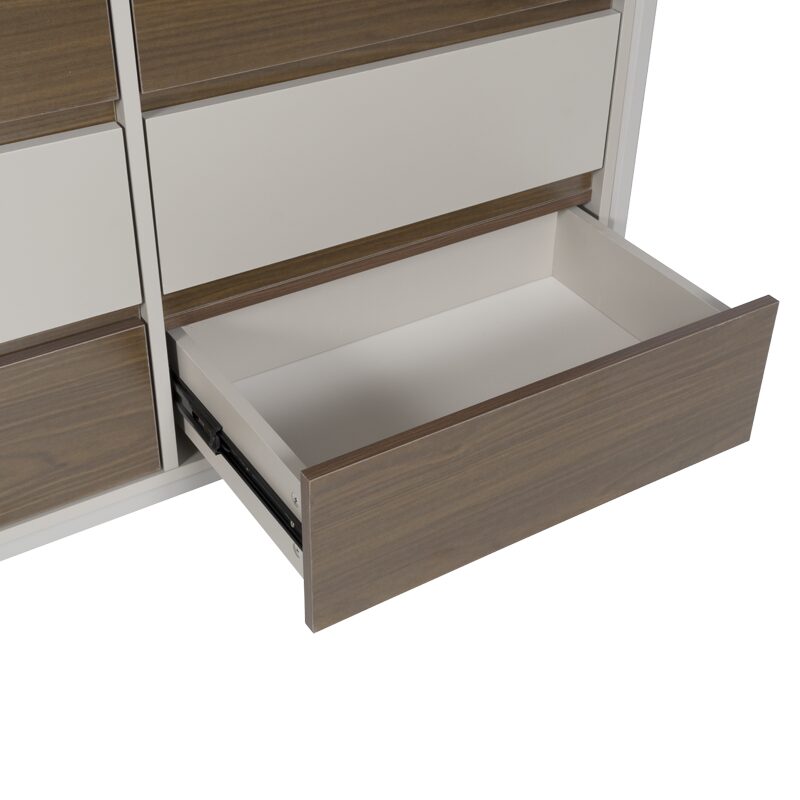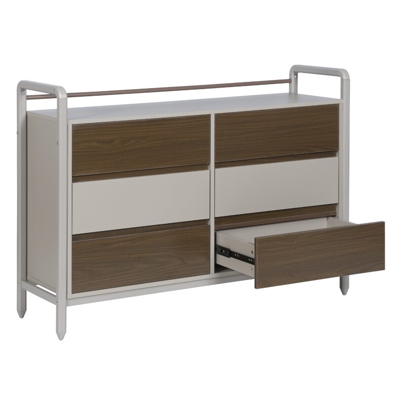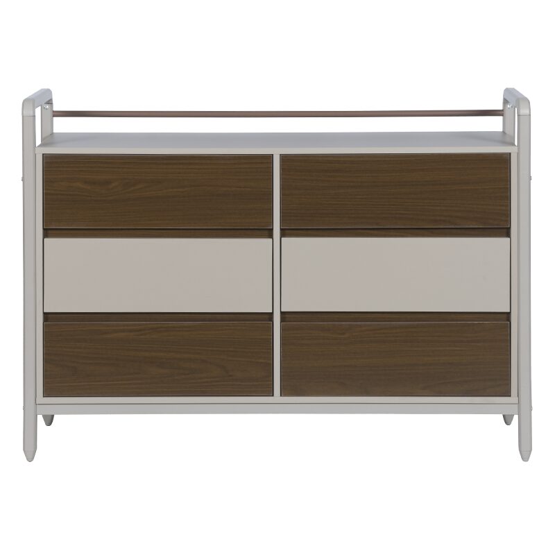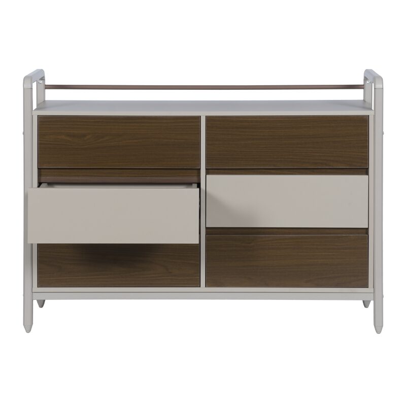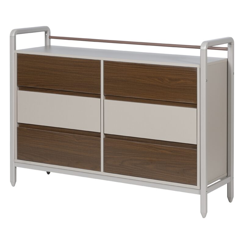 Скрин OSLOB е идеалното решение за модерния дом, съчетавайки стилен индустриален дизайн с функционалност. Шестте чекмеджета предлагат обширно място за съхранение на дрехи и аксесоари, докато елегантната комбинация от дървесен и капучино нюанс добавя изисканост. Изработен от висококачествени материали като ПДЧ, меламин и праховобоядисан метал, този скрин е дълготрайно и стилно допълнение към всяко помещение.