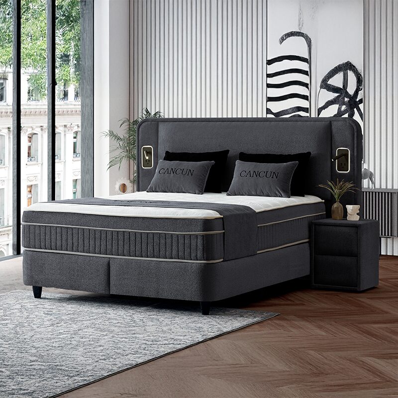 Насладете се на съвършен комфорт и стил с тапицираната спалня CANCUN 160 x 200. Със своята висококачествена изработка, включваща мек текстил и интегрирано LED осветление, тази спалня съчетава елегантност и функционалност. Практичната ракла под матрака предлага допълнително място за съхранение, а двулицевият матрак с покет пружини и еластична пяна осигурява несравнима опора и удобство.
