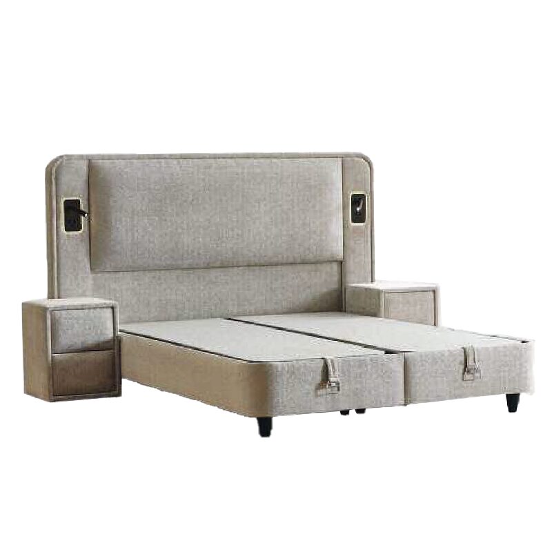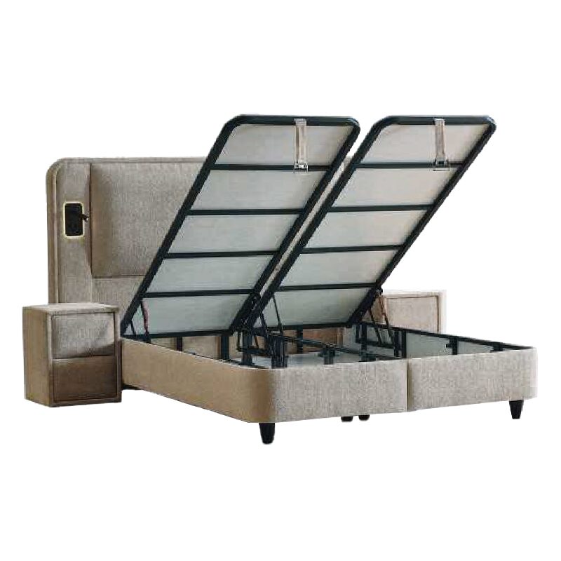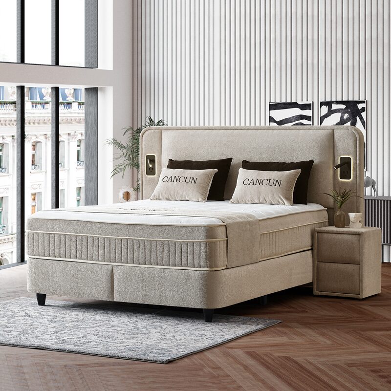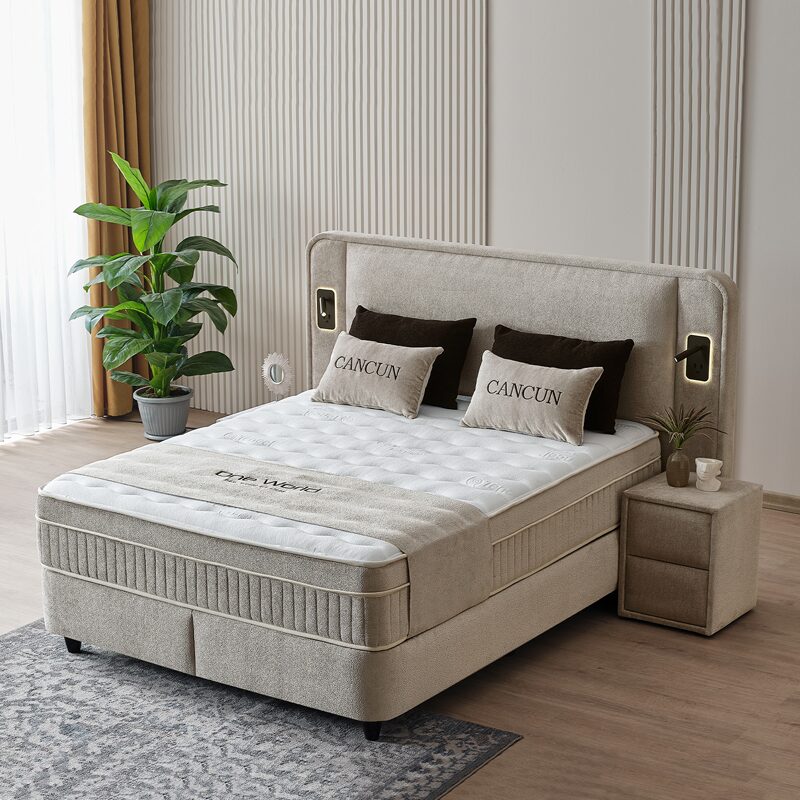 Насладете се на луксозния комфорт на тапицираната спалня CANCUN 180 x 200 в елегантен бежов цвят. С високата си табла и вградени LED лампи, тя предлага модерна визия и релаксираща атмосфера. Двулицевият матрак с покет пружини и пухена вложка осигурява перфектна поддръжка, докато функционалната ракла под него предоставя допълнително място за съхранение.