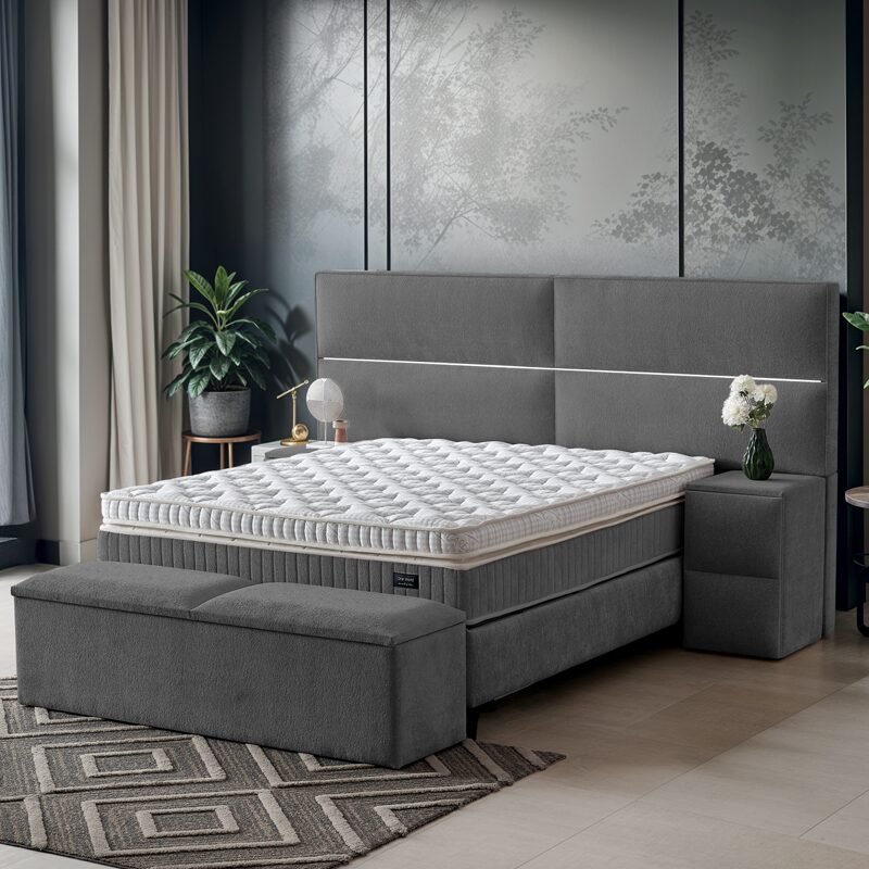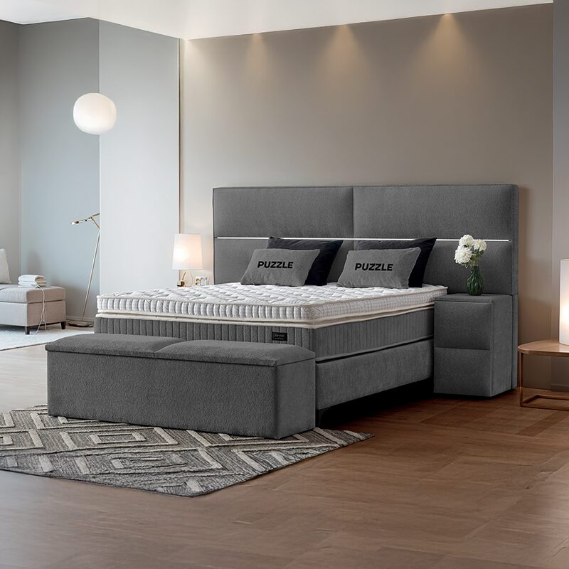 Тапицираната спалня с матрак PUZZLE 180 х 200 предлага съвършено удобство и стил за вашия дом. С висока табла, мека тапицерия и елегантен декоративен шев, тя създава усещане за простор. Вградена LED лента добавя топлина и уют. Двулицевият матрак с покет пружини и еластична пяна осигурява комфорт и подкрепа, а просторната ракла под леглото е идеална за съхранение.