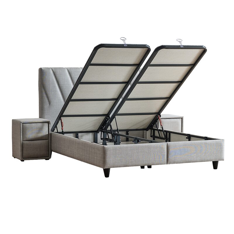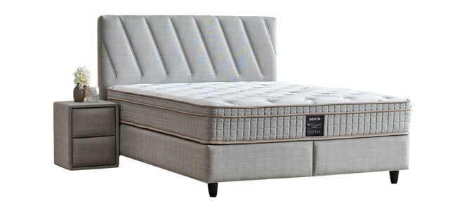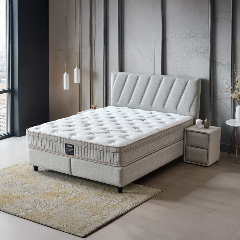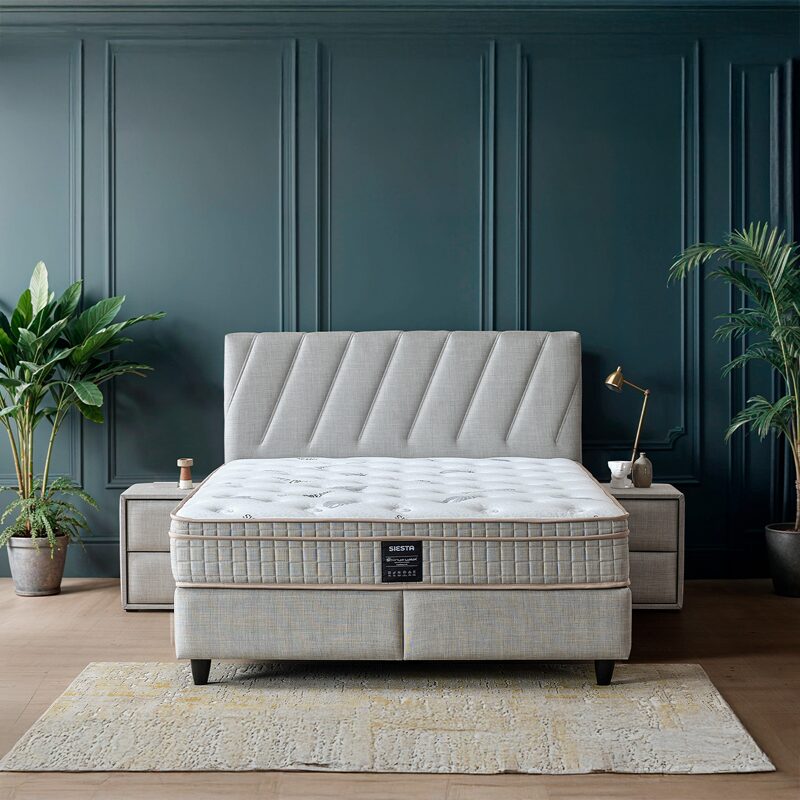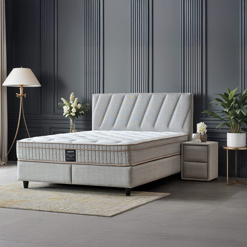 Подарете си заслужена почивка с тапицираната спалня SIESTA 160×200, която съчетава комфорт и стил. С елегантна светло сива дамаска и изчистена табла, тя внася уют във всяка спалня. Вграденият двулицев матрак с бонел пружини и еластична пяна предлага стабилна опора. Практичната ракла осигурява допълнително място за съхранение.