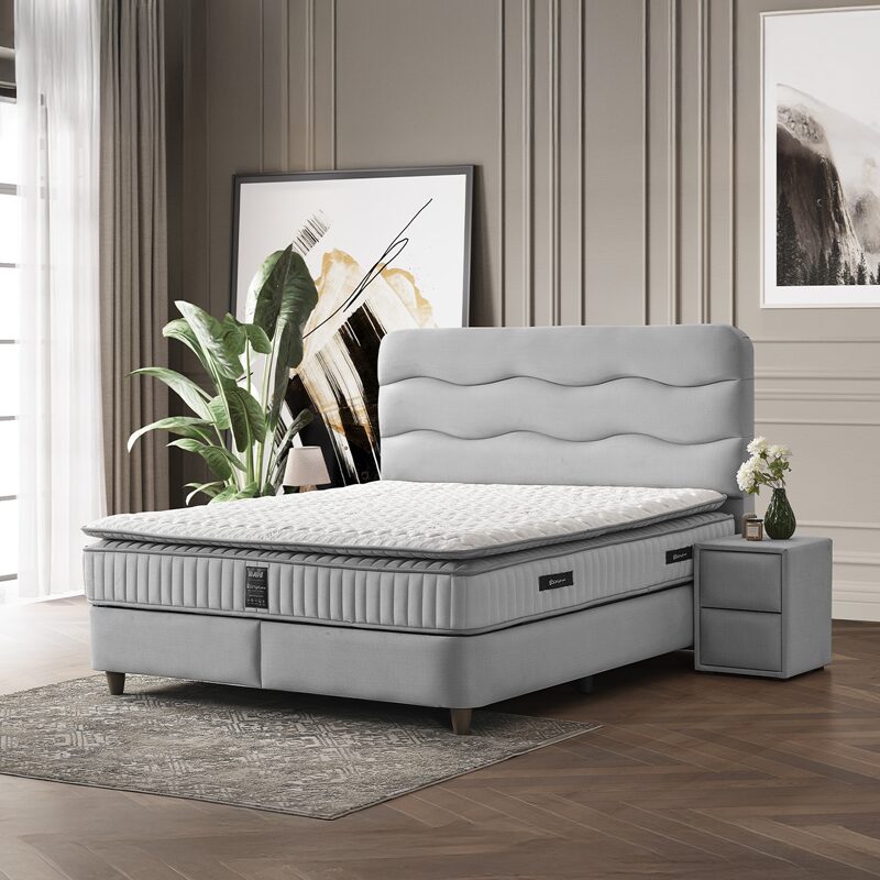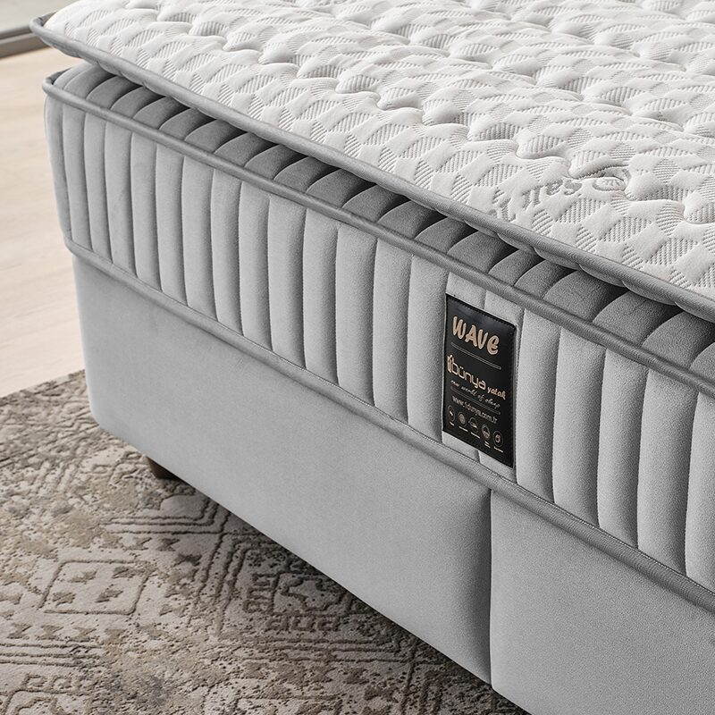 Тапицираната спалня с матрак WAVE 180 x 200 предлага луксозен комфорт и стил за вашата спалня. С вълнообразна табла и елегантна, pet friendly дамаска, тя е устойчива на надраскване. Двулицевият матрак с покет пружини и еластична пяна гарантира ортопедична опора и спокоен сън. Практичната ракла осигурява допълнително място за съхранение.