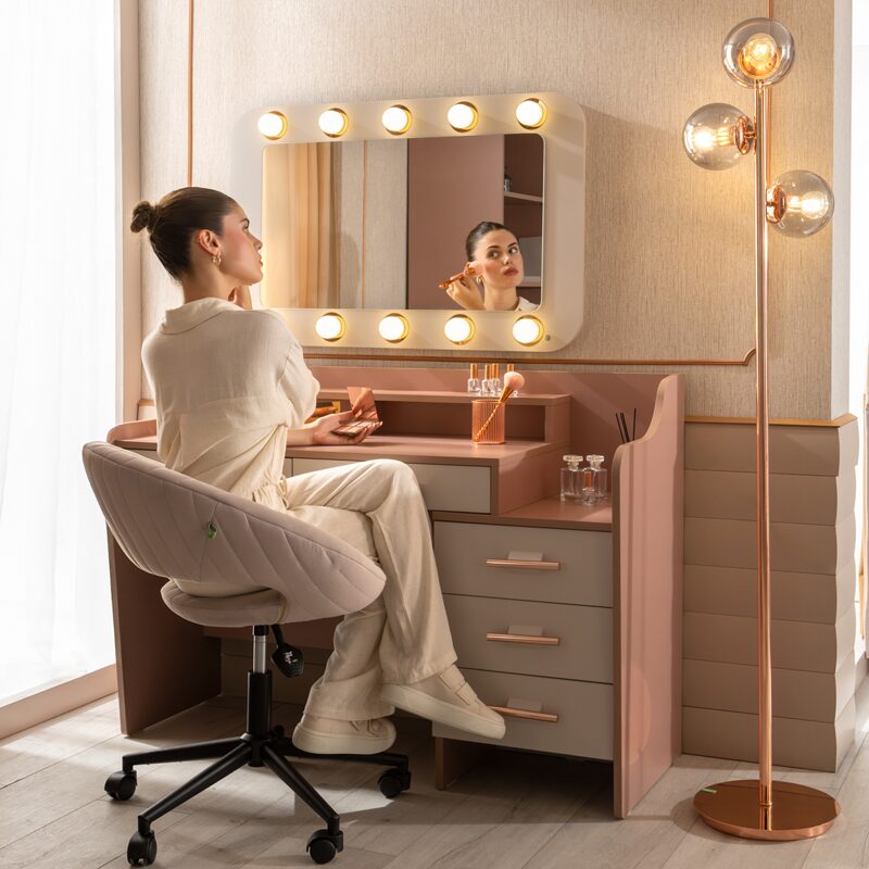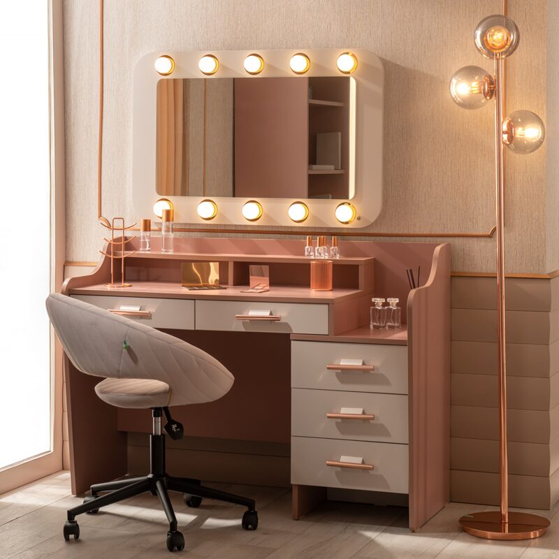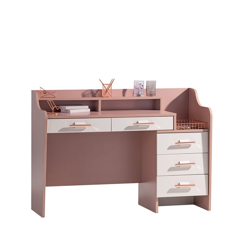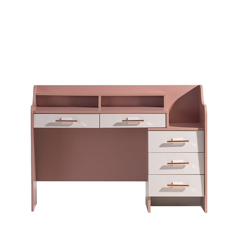 Тоалетката ESTELLA е перфектното решение за стил и организация в детската или тийнейджърската стая. Със своята широка повърхност и пет чекмеджета с удобни разделения, тя осигурява оптимално място за грим и аксесоари. Изработена от висококачествено ПДЧ, ESTELLA предлага издръжливост и елегантен дизайн, който ще допълни всяка интериорна концепция. Проверете таблицата за допълнителна информация за размерите.