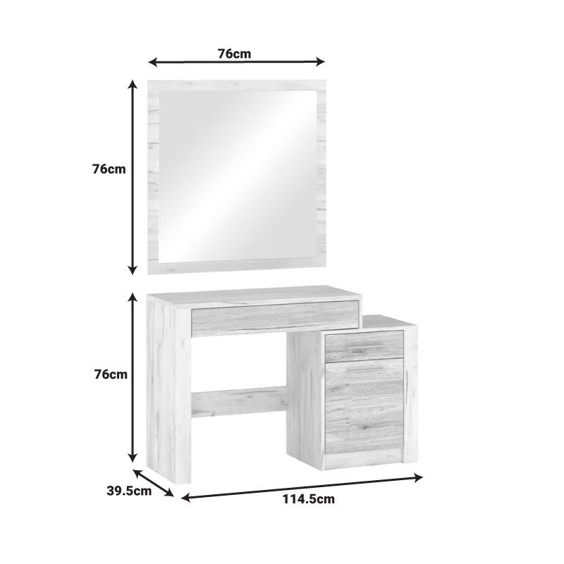 Тоалетката е налична в бяло антично-дъбов цвят и се доставя в разглобен вид с инструкции за лесен монтаж.