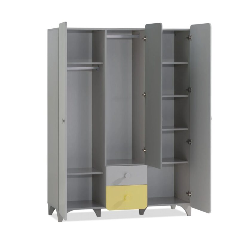 Трикрилният гардероб MINIA е идеалното решение за организирано съхранение на дрехи и играчки в детската стая. Със своите три отделения, два лоста за закачалки и четири рафта с товароносимост до 25 кг, той предлага изобилие от пространство. Изработен от висококачествени ПДЧ и МДФ материали, гардеробът разполага с плавно затварящи се вратички за безопасност и безшумност.